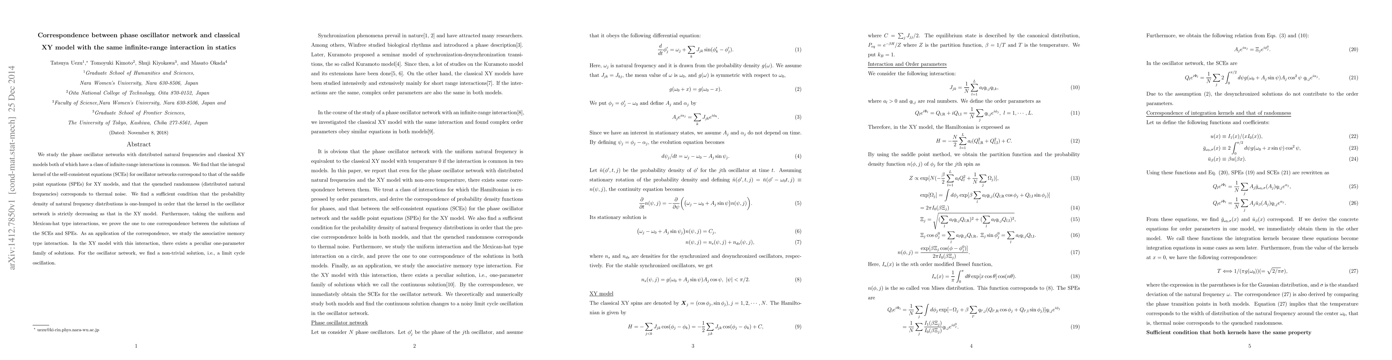 This paper establishes a correspondence between phase oscillator networks with infinite-range interactions and classical XY models, showing that their self-consistent equations and saddle point equations respectively match. It also demonstrates a one-to-one correspondence between solutions under uniform and specific interaction types, revealing a non-trivial limit cycle oscillation in the oscillator network.