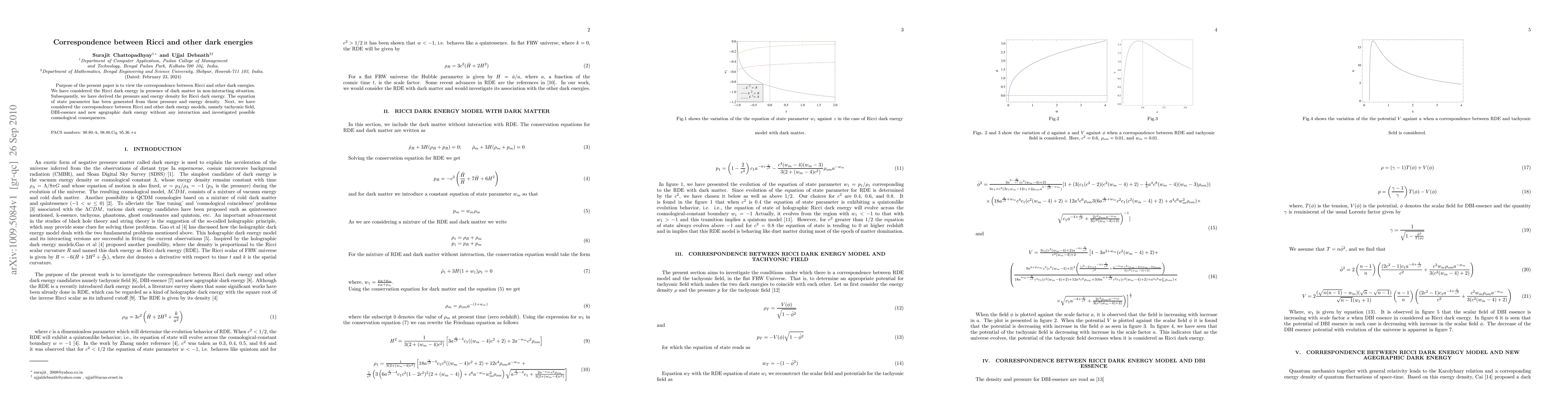 This paper investigates the correspondence between Ricci dark energy and other dark energy models, deriving pressure and energy density for Ricci dark energy and comparing it with tachyonic field, DBI-essence, and new agegraphic dark energy in a non-interacting scenario to explore potential cosmological implications.