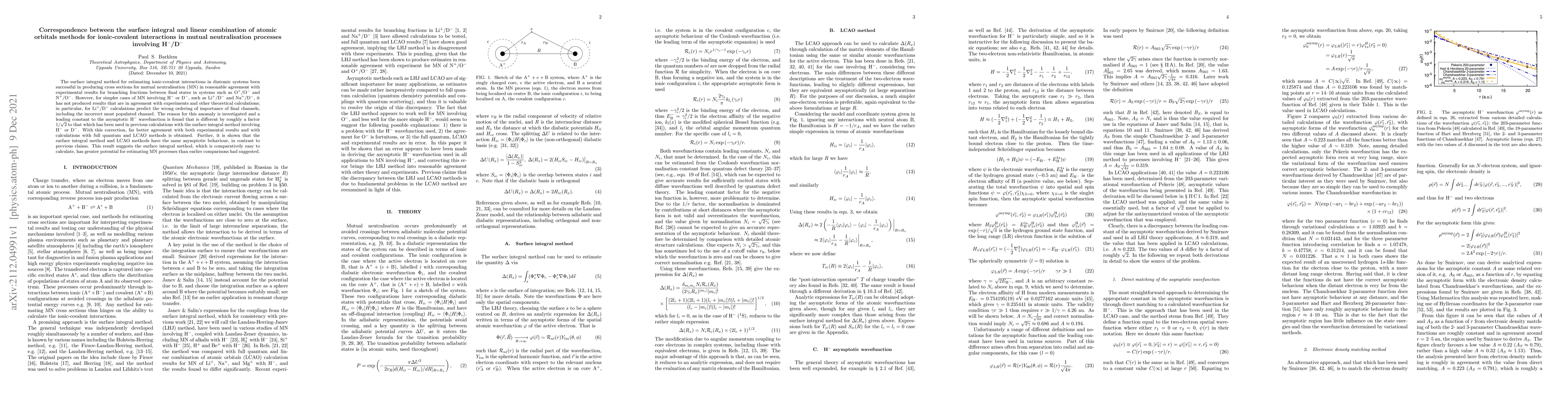 The surface integral method for estimating ionic-covalent interactions in diatomic systems been successful in producing cross sections for mutual neutralisation (MN) in reasonable agreement with experimental results for branching fractions between final states in systems such as O$^+$/O$^-$ and N$^+$/O$^-$. However, for simpler cases of MN involving H$^-$ or D$^-$, such as Li$^+$/D$^-$ and Na$^+$/D$^-$, it has not produced results that are in agreement with experiments and other theoretical calculations; in particular, for Li$^+$/D$^-$ calculations predict the wrong ordering of importance of final channels, including the incorrect most populated channel. The reason for this anomaly is investigated and a leading constant to the asymptotic H$^-$ wavefunction is found that is different by roughly a factor $1/\sqrt{2}$ to that which has been used in previous calculations with the surface integral method involving H$^-$ or D$^-$. With this correction, far better agreement with both experimental results and with calculations with full quantum and LCAO methods is obtained. Further, it is shown that the surface integral method and LCAO methods have the same asymptotic behaviour, in contrast to previous claims. This result suggests the surface integral method, which is comparatively easy to calculate, has greater potential for estimating MN processes than earlier comparisons had suggested.