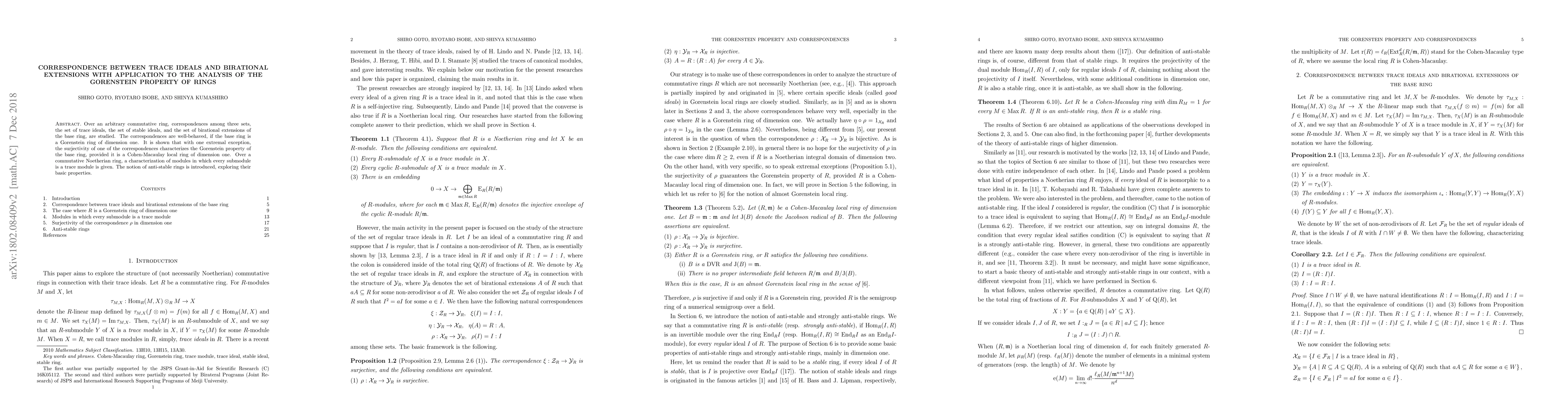 Over an arbitrary commutative ring, correspondences among three sets, the set of trace ideals, the set of stable ideals, and the set of birational extensions of the base ring, are studied. The correspondences are well-behaved, if the base ring is a Gorenstein ring of dimension one. It is shown that with one extremal exception, the surjectivity of one of the correspondences characterizes the Gorenstein property of the base ring, provided it is a Cohen-Macaulay local ring of dimension one. Over a commutative Noetherian ring, a characterization of modules in which every submodule is a trace module is given. The notion of anti-stable rings is introduced, exploring their basic properties.