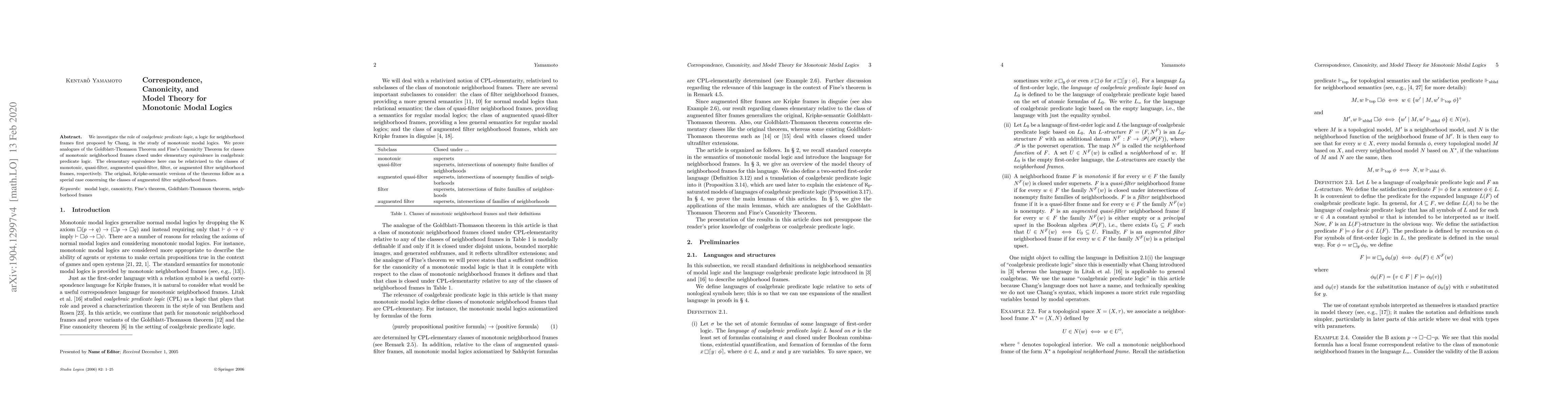We investigate the role of coalgebraic predicate logic, a logic for neighborhood frames first proposed by Chang, in the study of monotonic modal logics. We prove analogues of the Goldblatt-Thomason Theorem and Fine's Canonicity Theorem for classes of monotonic neighborhood frames closed under elementary equivalence in coalgebraic predicate logic. The elementary equivalence here can be relativized to the classes of monotonic, quasi-filter, augmented quasi-filter, filter, or augmented filter neighborhood frames, respectively. The original, Kripke-semantic versions of the theorems follow as a special case concerning the classes of augmented filter neighborhood frames.
