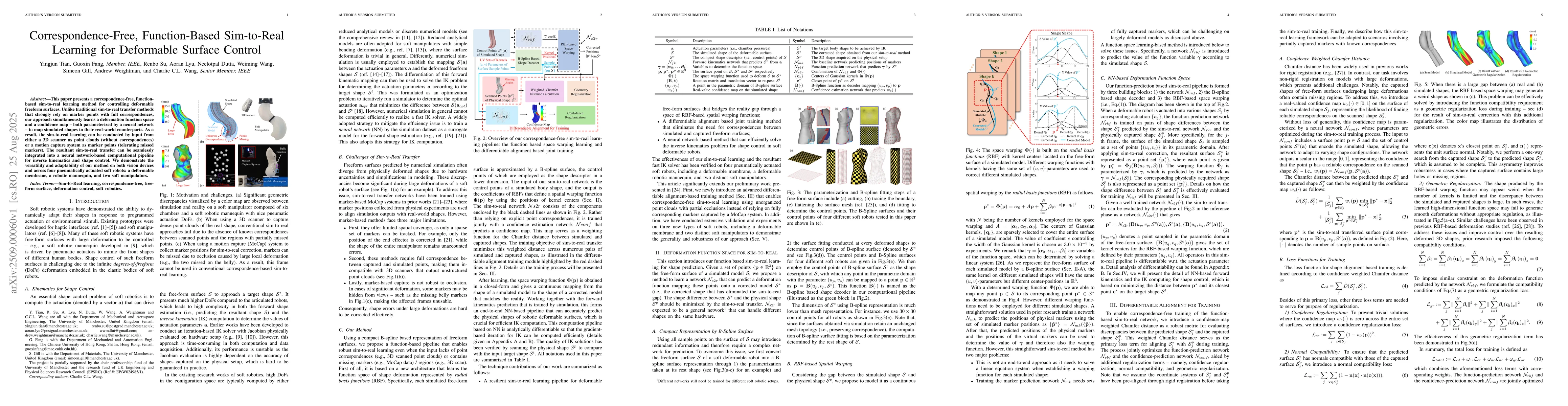 This paper presents a correspondence-free, function-based sim-to-real learning method for controlling deformable freeform surfaces. Unlike traditional sim-to-real transfer methods that strongly rely on marker points with full correspondences, our approach simultaneously learns a deformation function space and a confidence map -- both parameterized by a neural network -- to map simulated shapes to their real-world counterparts. As a result, the sim-to-real learning can be conducted by input from either a 3D scanner as point clouds (without correspondences) or a motion capture system as marker points (tolerating missed markers). The resultant sim-to-real transfer can be seamlessly integrated into a neural network-based computational pipeline for inverse kinematics and shape control. We demonstrate the versatility and adaptability of our method on both vision devices and across four pneumatically actuated soft robots: a deformable membrane, a robotic mannequin, and two soft manipulators.
