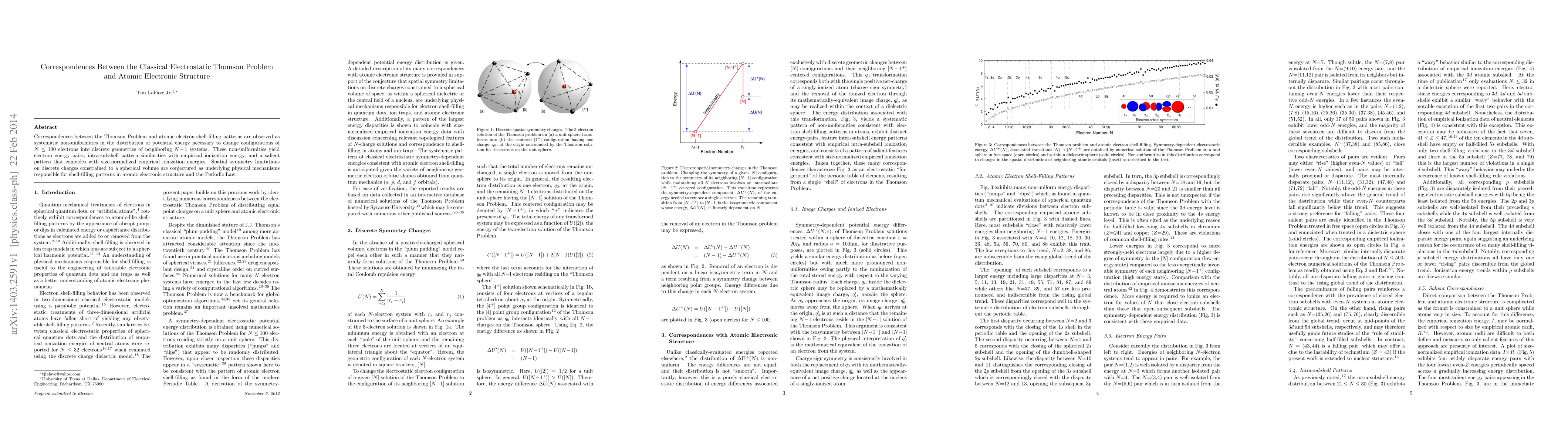 Correspondences between the Thomson Problem and atomic electron shell-filling patterns are observed as systematic non-uniformities in the distribution of potential energy necessary to change configurations of $N\le 100$ electrons into discrete geometries of neighboring $N-1$ systems. These non-uniformities yield electron energy pairs, intra-subshell pattern similarities with empirical ionization energy, and a salient pattern that coincides with size-normalized empirical ionization energies. Spatial symmetry limitations on discrete charges constrained to a spherical volume are conjectured as underlying physical mechanisms responsible for shell-filling patterns in atomic electronic structure and the Periodic Law.