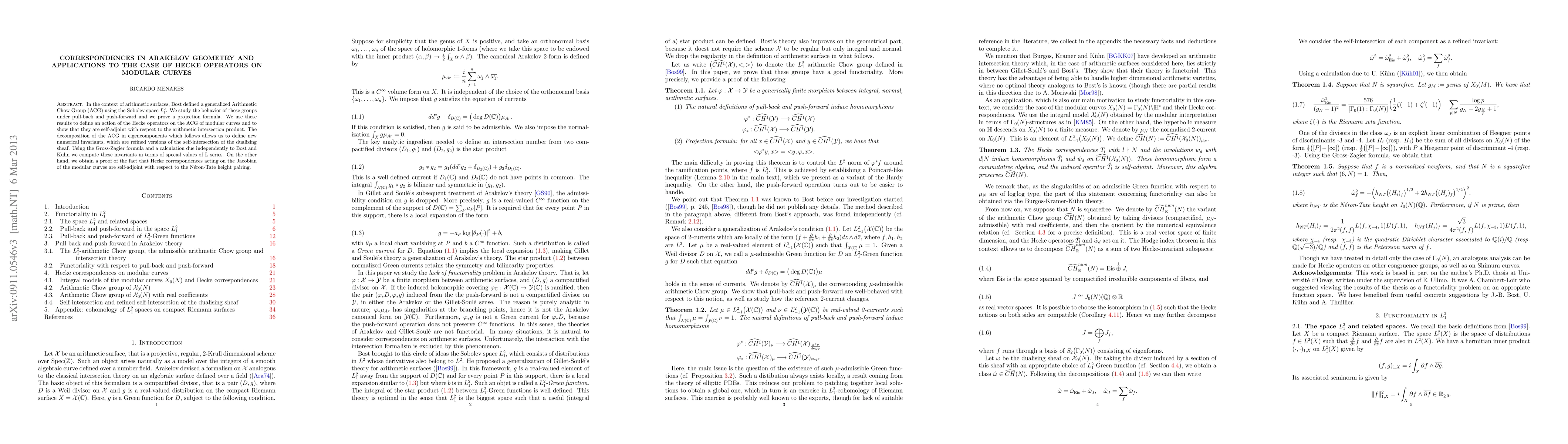 In the context of arithmetic surfaces, Bost defined a generalized Arithmetic Chow Group (ACG) using the Sobolev space L^2_1. We study the behavior of these groups under pull-back and push-forward and we prove a projection formula. We use these results to define an action of the Hecke operators on the ACG of modular curves and to show that they are self-adjoint with respect to the arithmetic intersection product. The decomposition of the ACG in eigencomponents which follows allows us to define new numerical invariants, which are refined versions of the self-intersection of the dualizing sheaf. Using the Gross-Zagier formula and a calculation due independently to Bost and Kuehn we compute these invariants in terms of special values of L series. On the other hand, we obtain a proof of the fact that Hecke correspondences acting on the Jacobian of the modular curves are self-adjoint with respect to the N\'eron-Tate height pairing.