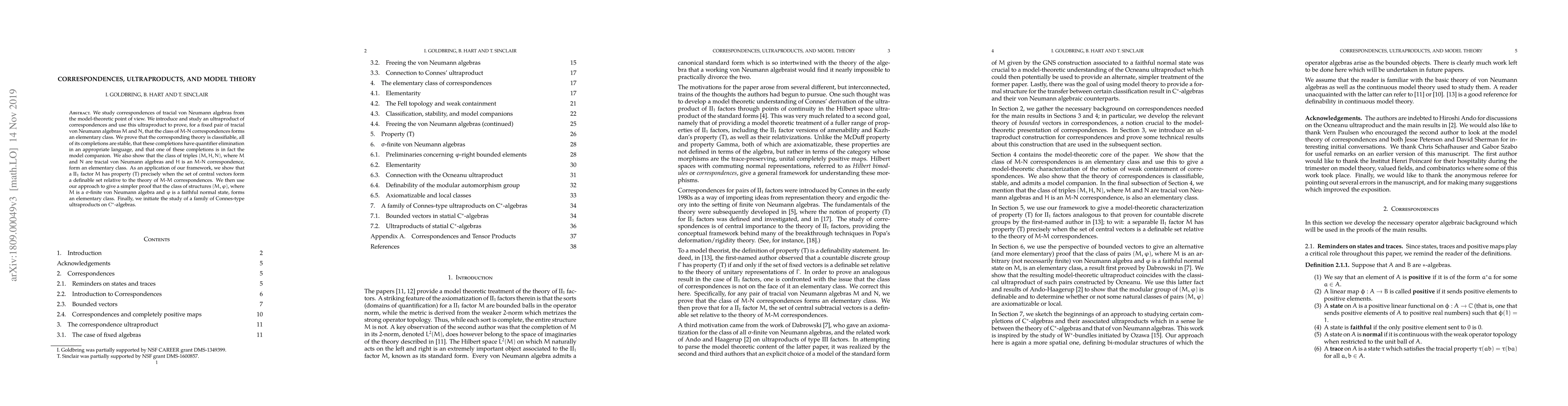 We study correspondences of tracial von Neumann algebras from the model-theoretic point of view. We introduce and study an ultraproduct of correspondences and use this ultraproduct to prove, for a fixed pair of tracial von Neumann algebras M and N, that the class of M-N correspondences forms an elementary class. We prove that the corresponding theory is classifiable, all of its completions are stable, that these completions have quantifier elimination in an appropriate language, and that one of these completions is in fact the model companion. We also show that the class of triples (M, H, N), where M and N are tracial von Neumann algebras and H is an M-N correspondence, form an elementary class. As an application of our framework, we show that a II_1 factor M has property (T) precisely when the set of central vectors form a definable set relative to the theory of M-M correspondences. We then use our approach to give a simpler proof that the class of structures (M, Phi), where M is a sigma-finite von Neumann algebra and Phi is a faithful normal state, forms an elementary class. Finally, we initiate the study of a family of Connes-type ultraproducts on C*-algebras.