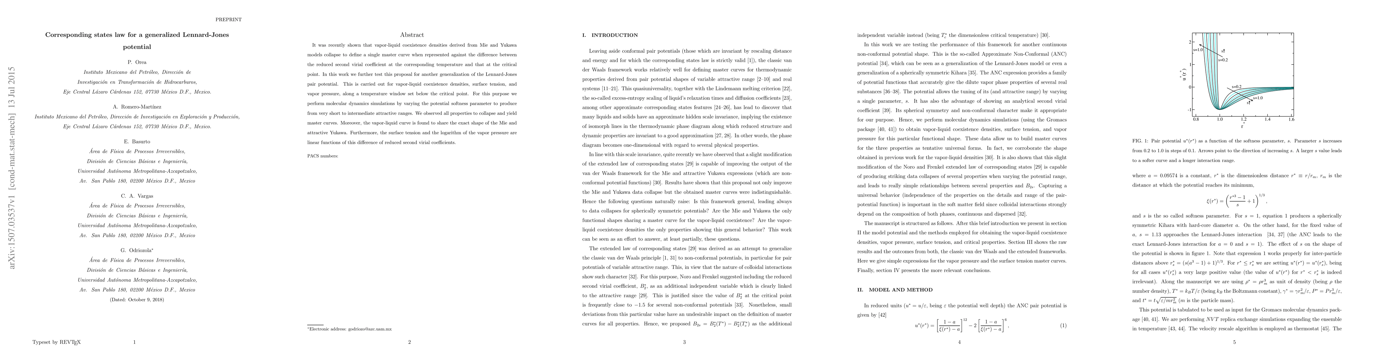 It was recently shown that vapor-liquid coexistence densities derived from Mie and Yukawa models collapse to define a single master curve when represented against the difference between the reduced second virial coefficient at the corresponding temperature and that at the critical point. In this work we further test this proposal for another generalization of the Lennard-Jones pair potential. This is carried out for vapor-liquid coexistence densities, surface tension, and vapor pressure, along a temperature window set below the critical point. For this purpose we perform molecular dynamics simulations by varying the potential softness parameter to produce from very short to intermediate attractive ranges. We observed all properties to collapse and yield master curves. Moreover, the vapor-liquid curve is found to share the exact shape of the Mie and attractive Yukawa. Furthermore, the surface tension and the logarithm of the vapor pressure are linear functions of this difference of reduced second virial coefficients.