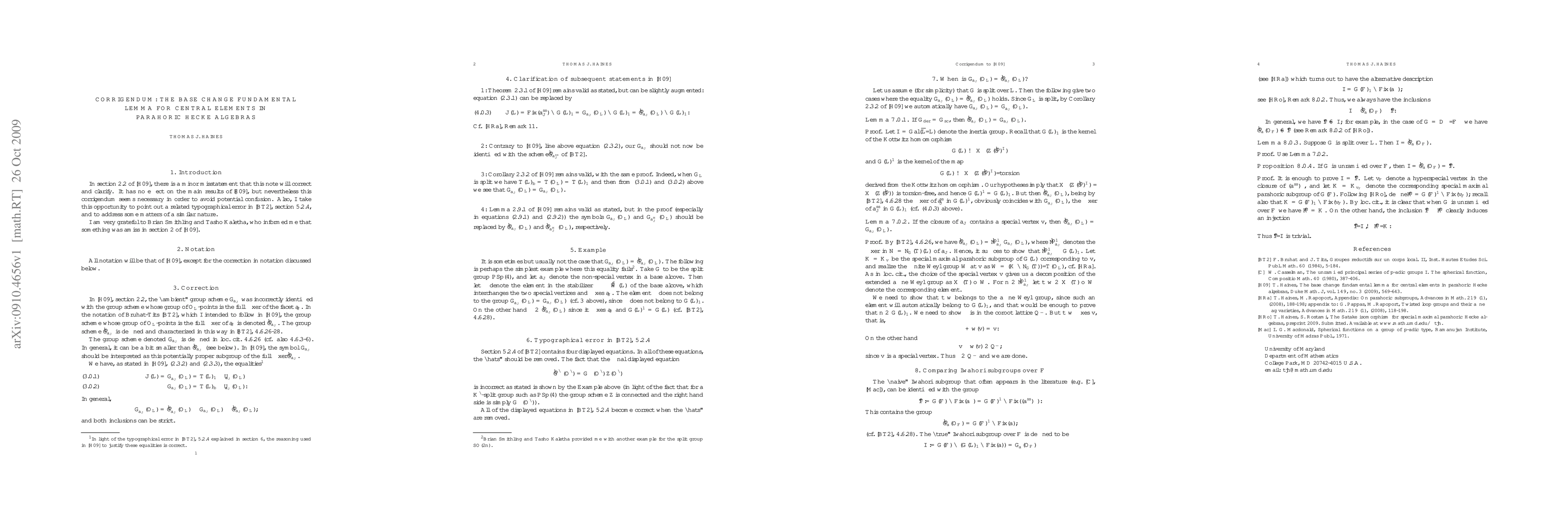 This corrigendum corrects a minor misstatement in section 2 of a previous paper on the base change fundamental lemma for central elements in parahoric Hecke algebras, addressing related issues without affecting the main results. The correction aims to prevent potential confusion.