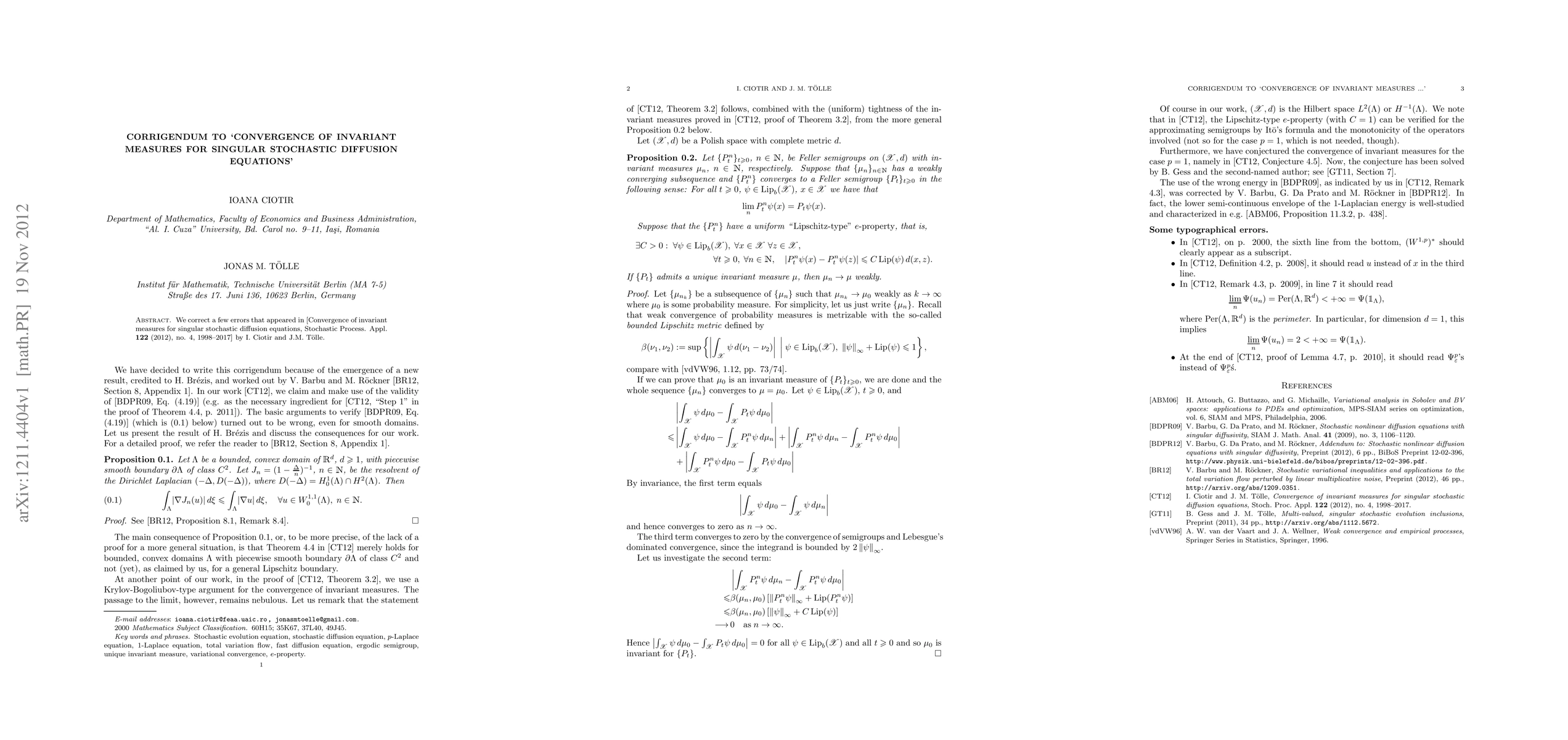 The paper corrects errors in a previous study on convergence of invariant measures for singular stochastic diffusion equations, clarifying key findings on the stability and uniqueness of solutions.