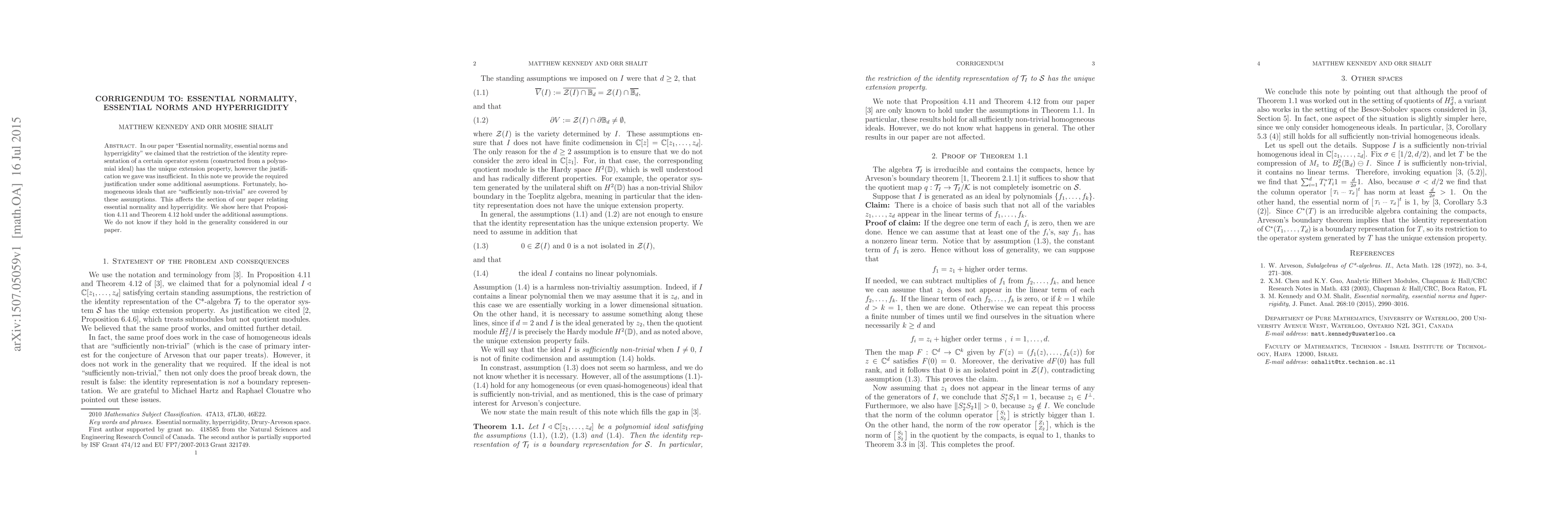 In our paper "Essential normality, essential norms and hyperrigidity" we claimed that the restriction of the identity representation of a certain operator system (constructed from a polynomial ideal) has the unique extension property, however the justification we gave was insufficient. In this note we provide the required justification under some additional assumptions. Fortunately, homogeneous ideals that are "sufficiently non-trivial" are covered by these assumptions. This affects the section of our paper relating essential normality and hyperrigidity. We show here that Proposition 4.11 and Theorem 4.12 hold under the additional assumptions. We do not know if they hold in the generality considered in our paper.