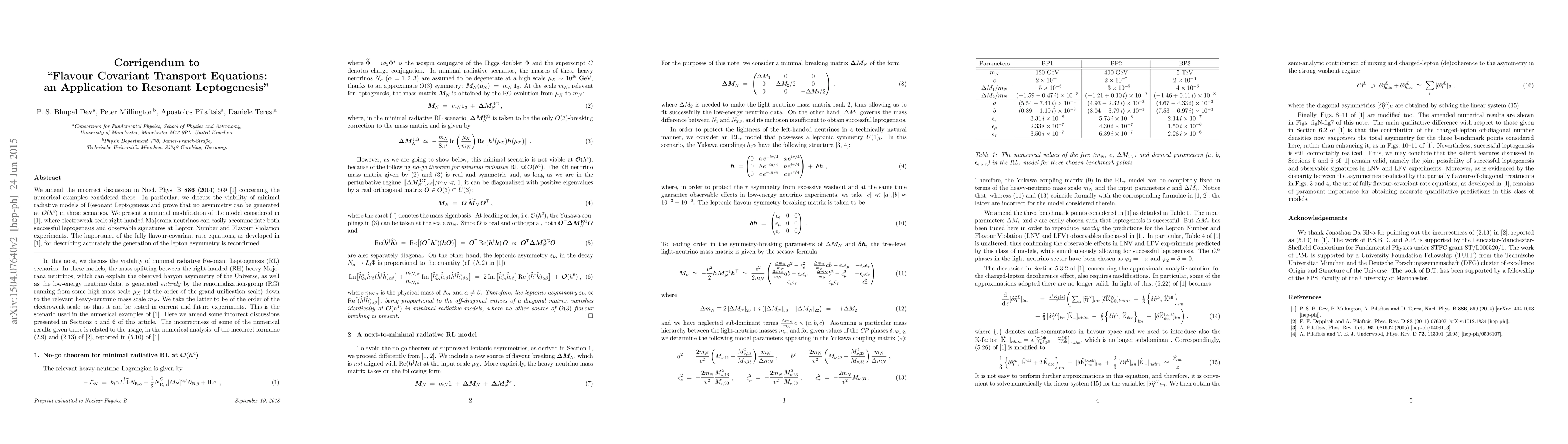 We amend the incorrect discussion in Nucl. Phys. B 886 (2014) 569 [1] concerning the numerical examples considered there. In particular, we discuss the viability of minimal radiative models of Resonant Leptogenesis and prove that no asymmetry can be generated at $\mathcal{O}(h^4)$ in these scenarios. We present a minimal modification of the model considered in [1], where electroweak-scale right-handed Majorana neutrinos can easily accommodate both successful leptogenesis and observable signatures at Lepton Number and Flavour Violation experiments. The importance of the fully flavour-covariant rate equations, as developed in [1], for describing accurately the generation of the lepton asymmetry is reconfirmed.