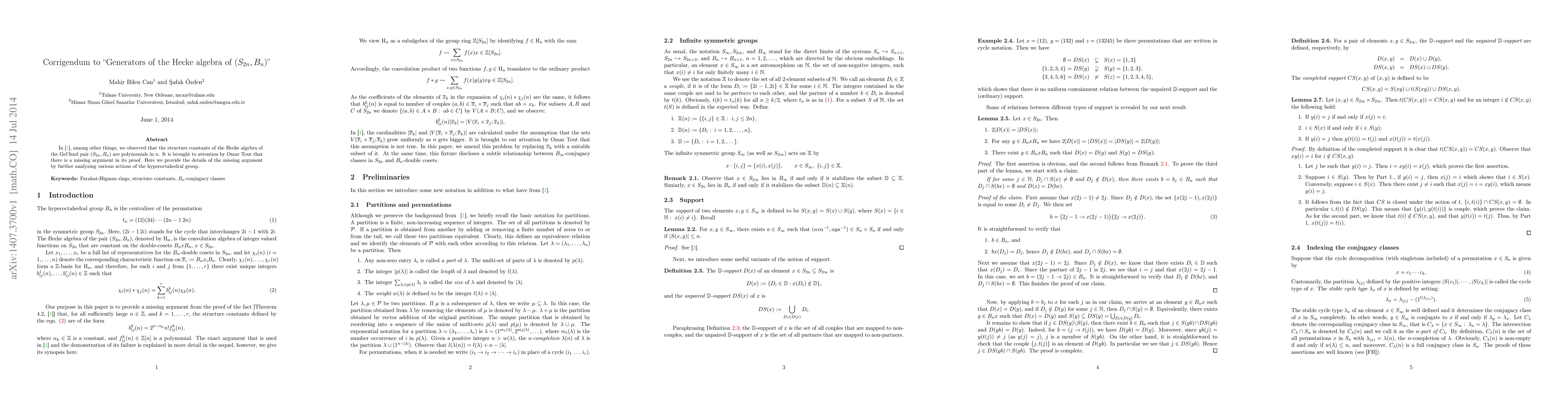 In \cite{AC12}, among other things, we observed that the structure constants of the Hecke algebra of the Gel'fand pair $(S_{2n},B_n)$ are polynomials in $n$. It is brought to attention by Omar Tout that there is a missing argument in its proof. Here we provide the details of the missing argument by further analyzing various actions of the hyperoctahedral group.
