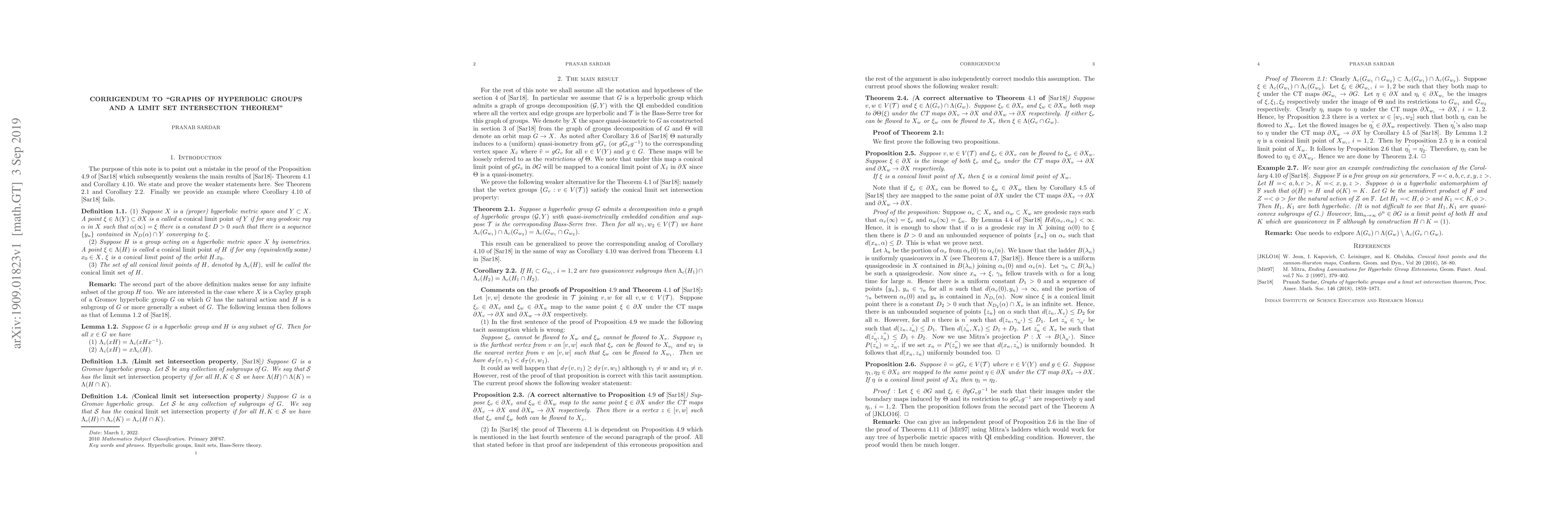 The purpose of this article is to point out a mistake in the published paper "Graphs of hyperbolic groups and limit set intersection theorem- Proc AMS, vol 146, no 5, pp 1859--1871, which subsequently weakens the main theorem of that paper. We state and prove a weaker result in this note.