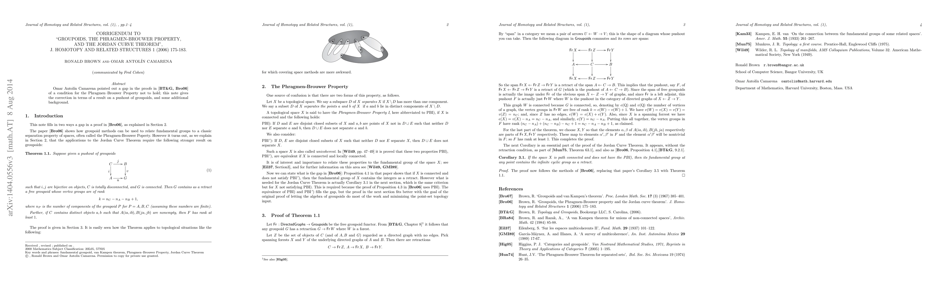 Omar Antol{\'\i}n Camarena pointed out a gap in the proofs in \cite{Brown15,BrownJordan} of a condition for the Phragmen--Brouwer Property not to hold; this note gives the correction in terms of a result on a pushout of groupoids, and some additional background.