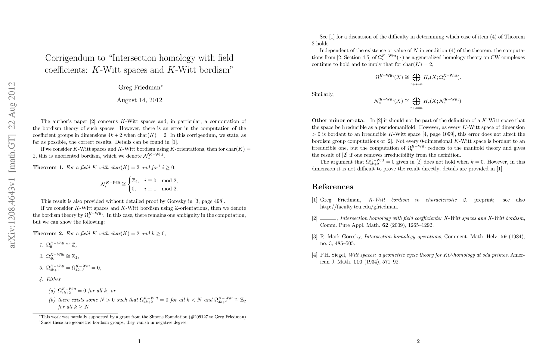Summary: This corrigendum rectifies an error in the author's previous computation regarding the bordism groups of K-Witt spaces when the field K has characteristic 2. The correction aims to maintain the accuracy of intersection homology with field coefficients.