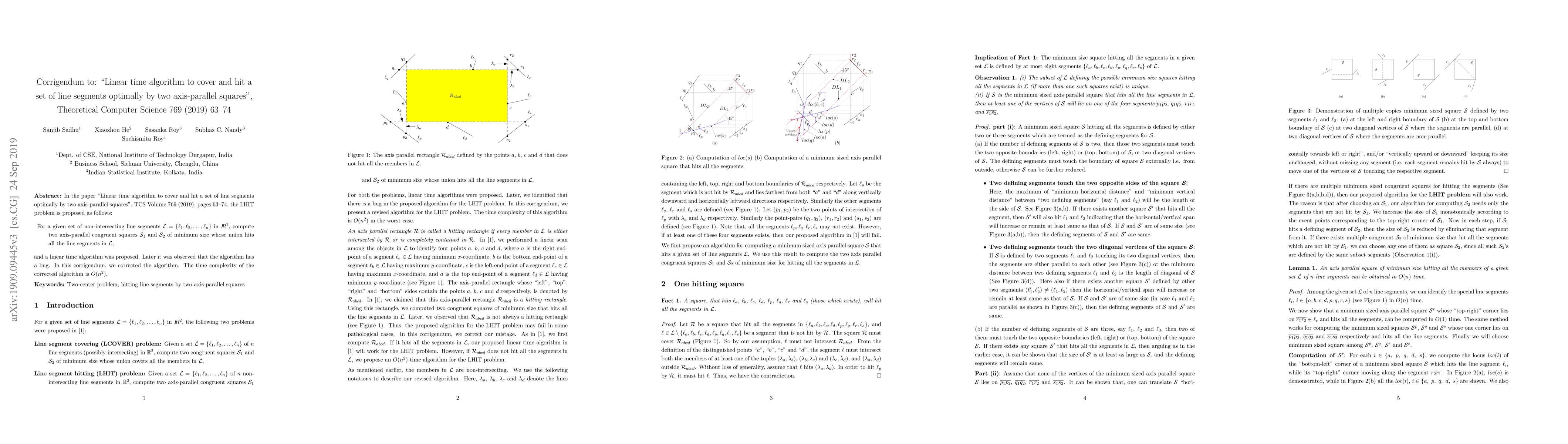 In the paper "Linear time algorithm to cover and hit a set of line segments optimally by two axis-parallel squares", TCS Volume 769 (2019), pages 63--74, the LHIT problem is proposed as follows: For a given set of non-intersecting line segments ${\cal L} = \{\ell_1, \ell_2, \ldots, \ell_n\}$ in $I\!\!R^2$, compute two axis-parallel congruent squares ${\cal S}_1$ and ${\cal S}_2$ of minimum size whose union hits all the line segments in $\cal L$, and a linear time algorithm was proposed. Later it was observed that the algorithm has a bug. In this corrigendum, we corrected the algorithm. The time complexity of the corrected algorithm is $O(n^2)$.