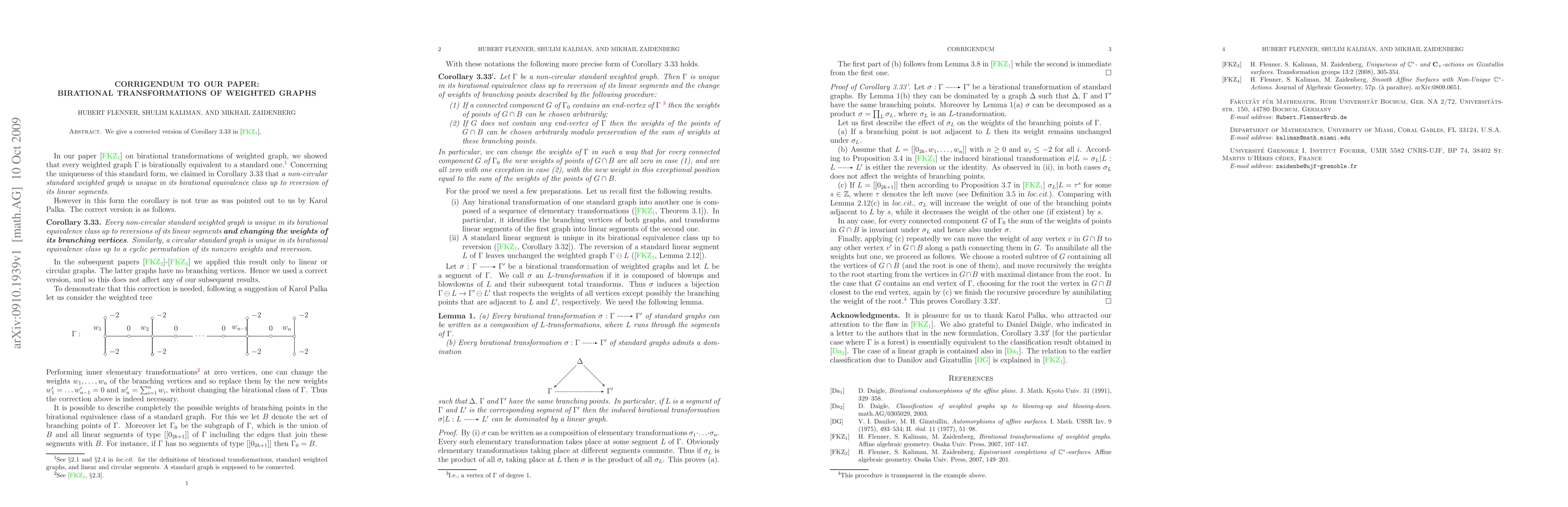 We give a corrected version of Corollary 3.33 in: H. Flenner, S. Kaliman, and M. Zaidenberg, Birational transformations of weighted graphs. Affine algebraic geometry. Osaka Univ. Press, 2007, 107-147.