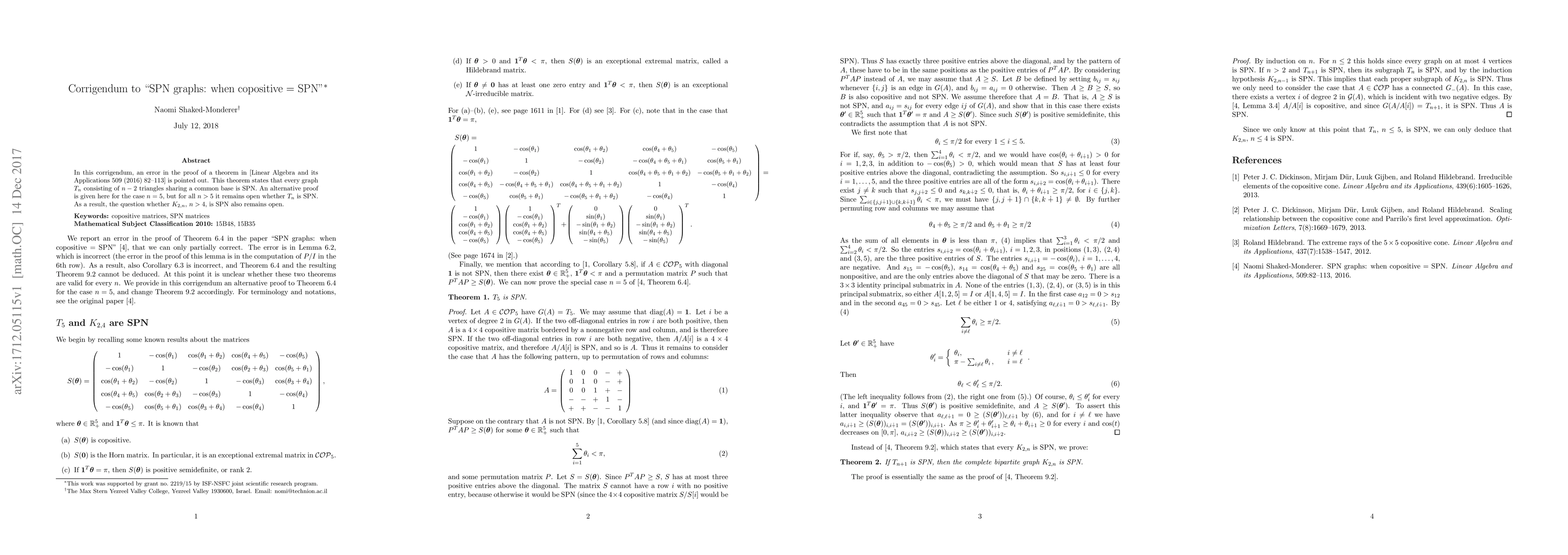 In this corrigendum, an error in the proof of a theorem in [Linear Algebra and its Applications 509 (2016) 82--113] is pointed out. This theorem states that every graph $T_n$ consisting of $n-2$ triangles sharing a common base is SPN. An alternative proof is given here for the case $n=5$, but for all $n>5$ it remains open whether $T_n$ is SPN. As a result, the question whether $K_{2,n}$, $n>4$, is SPN also remains open.