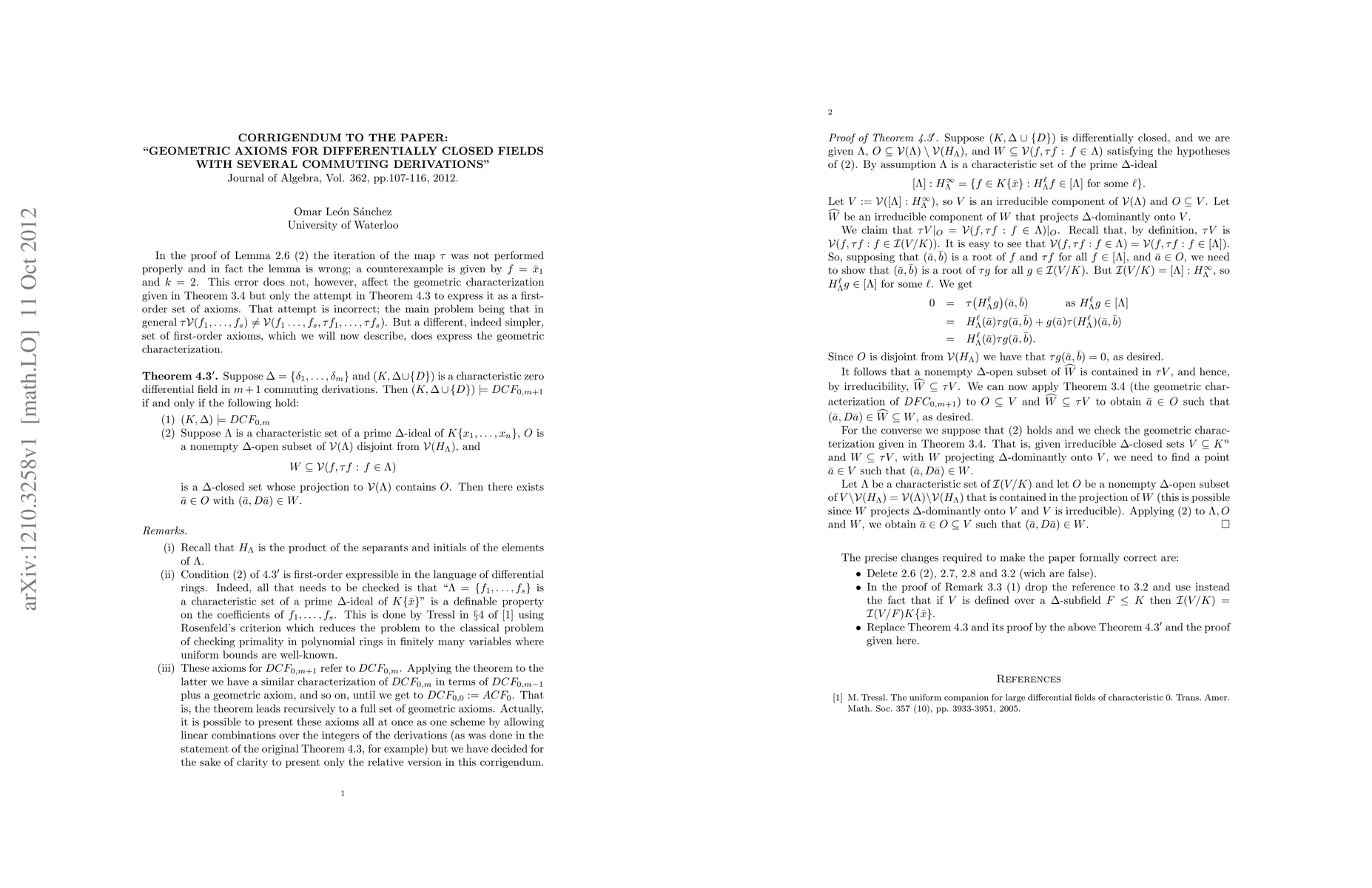 In the proof of Lemma 2.6 (2) the iteration of the map {\tau} was not performed properly and in fact the lemma is wrong; a counterexample is given by f = \bar{x}_1and k = 2. This error does not, however, affect the geometric characterization given in Theorem 3.4 but only the attempt in Theorem 4.3 to express it as a first-order set of axioms. That attempt is incorrect; the main problem being that in general {\tau}V(f_1,..., f_s) 6= V(f_1..., f_s, {\tau}f_1,..., {\tau}f_s). But a different, indeed simpler, set of first-order axioms, which we will now describe, does express the geometric characterization.