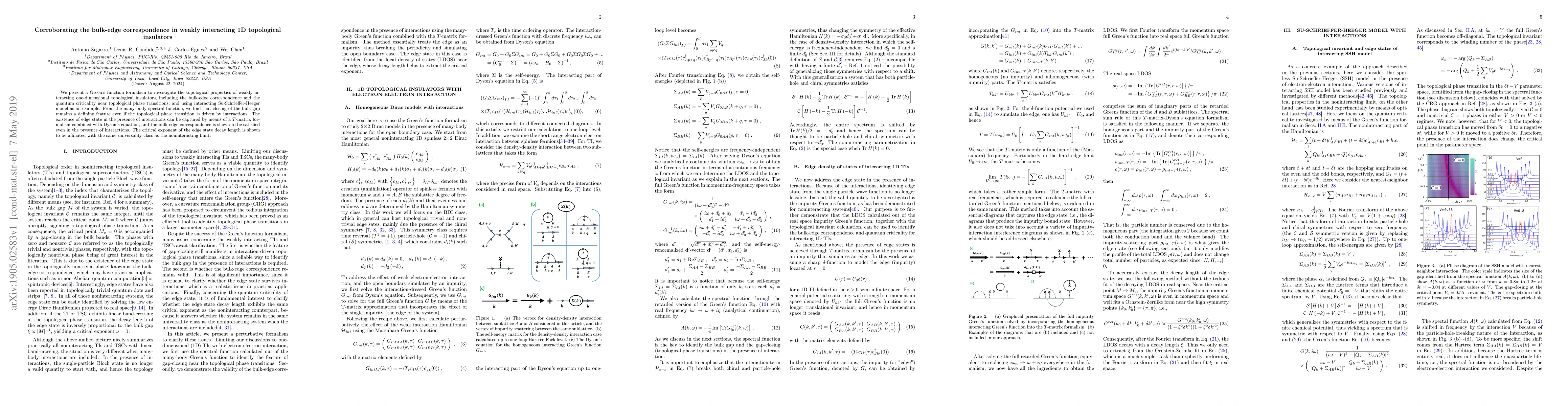 This paper uses a Green's function formalism to study topological properties in weakly interacting 1D topological insulators, confirming the bulk-edge correspondence even with interactions. The study shows that the closing of the bulk gap and the existence of edge states remain valid features, maintaining the same critical exponent universality class as in the noninteracting limit.