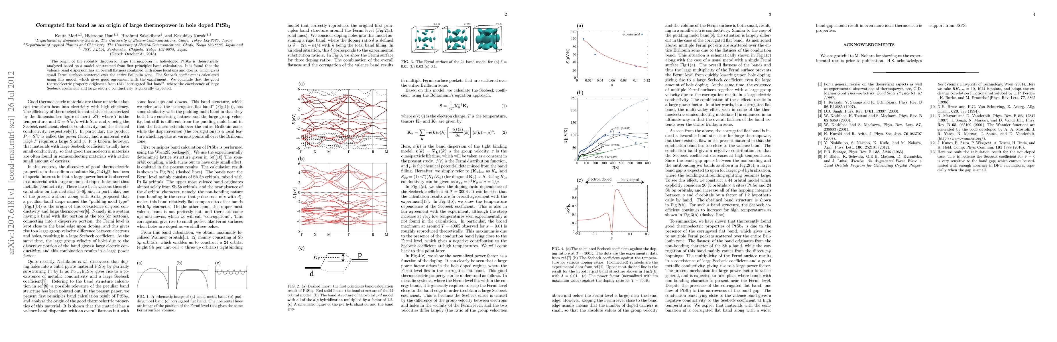 The study reveals that the large thermopower in hole-doped PtSb$_2$ arises from a "corrugated flat band," characterized by a flat valence band with localized variations, leading to small Fermi surfaces. This structure explains the observed high Seebeck coefficient and good thermoelectric properties.
