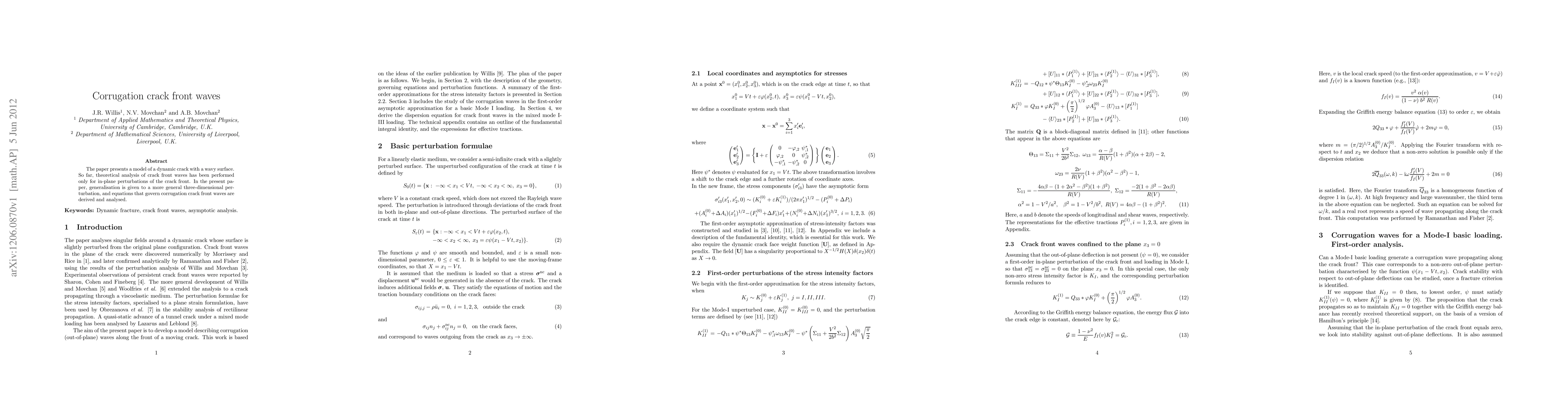 This paper develops a model for dynamic cracks with wavy surfaces, extending theoretical analysis to three-dimensional perturbations beyond in-plane cracks. It derives and analyzes equations governing corrugation crack front waves.