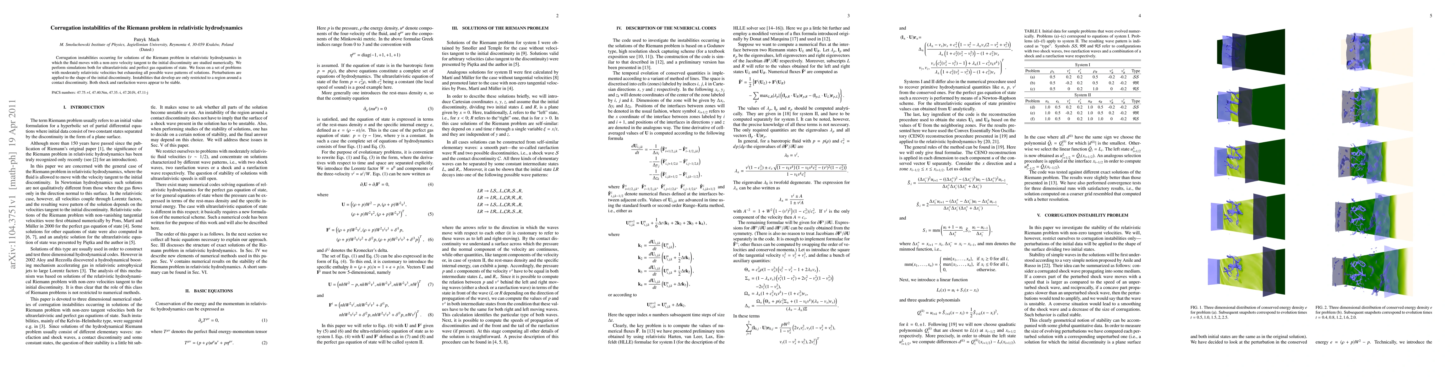 The paper presents a detailed numerical analysis of corrugation instabilities in relativistic hydrodynamics, employing advanced numerical methods and comparing results for ultrarelativistic and perfect gas equations of state.