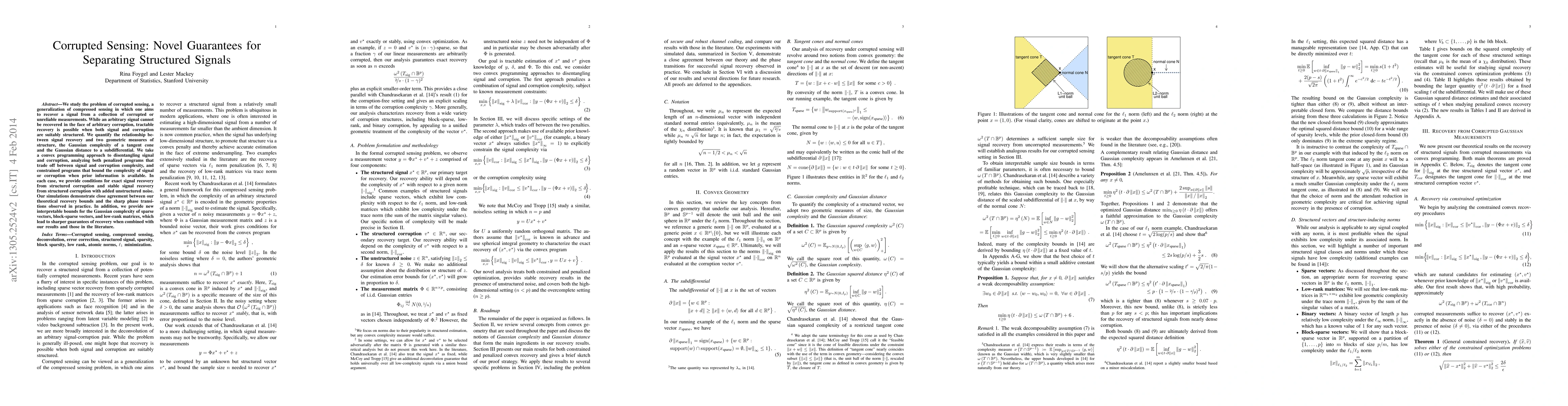 This paper investigates corrupted sensing, focusing on recovering structured signals from corrupted measurements. It provides theoretical guarantees for exact and stable signal recovery based on the Gaussian complexity and distance measures, and demonstrates practical recovery bounds through simulations.