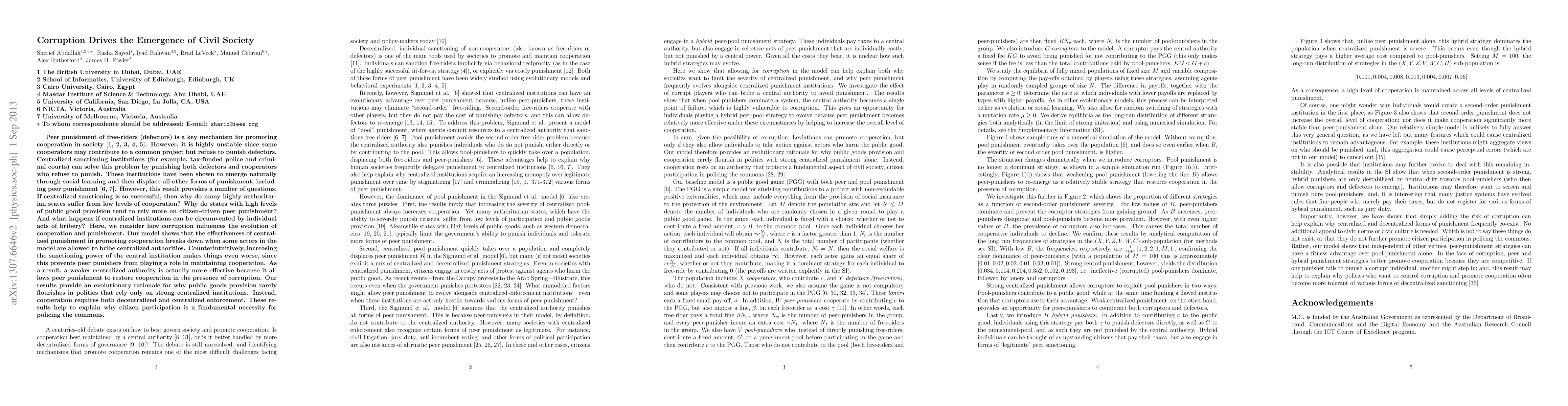 Corruption weakens centralized punishment, but weaker authorities can restore cooperation through peer punishment; citizen participation is crucial for effective policing of the commons.