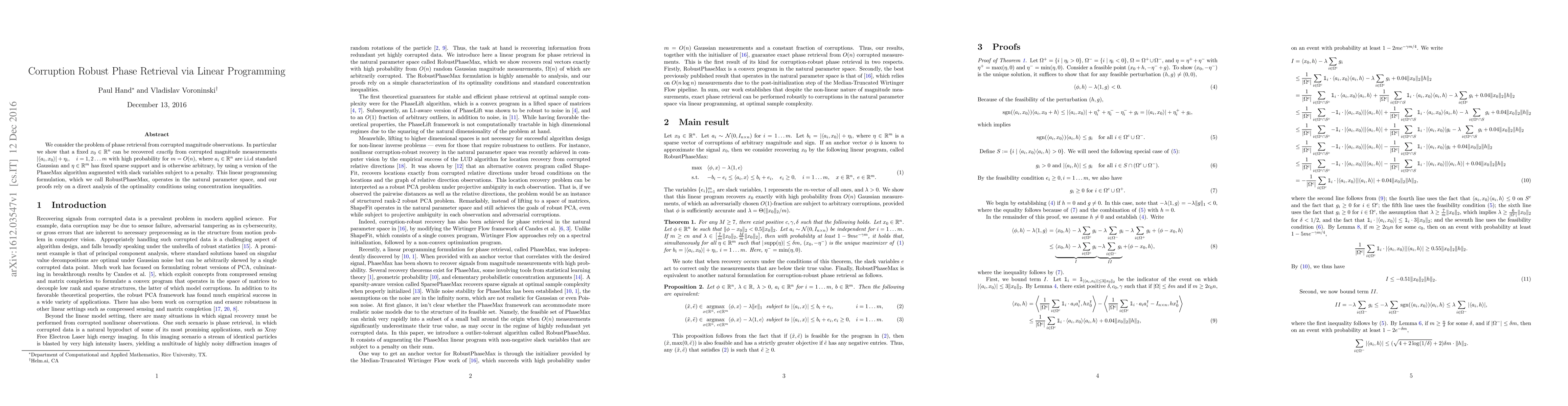 This paper presents a linear programming approach, RobustPhaseMax, to accurately recover a fixed vector from corrupted magnitude observations using the PhaseMax algorithm. The method effectively handles sparse noise and operates in the natural parameter space, with proofs relying on concentration inequalities.