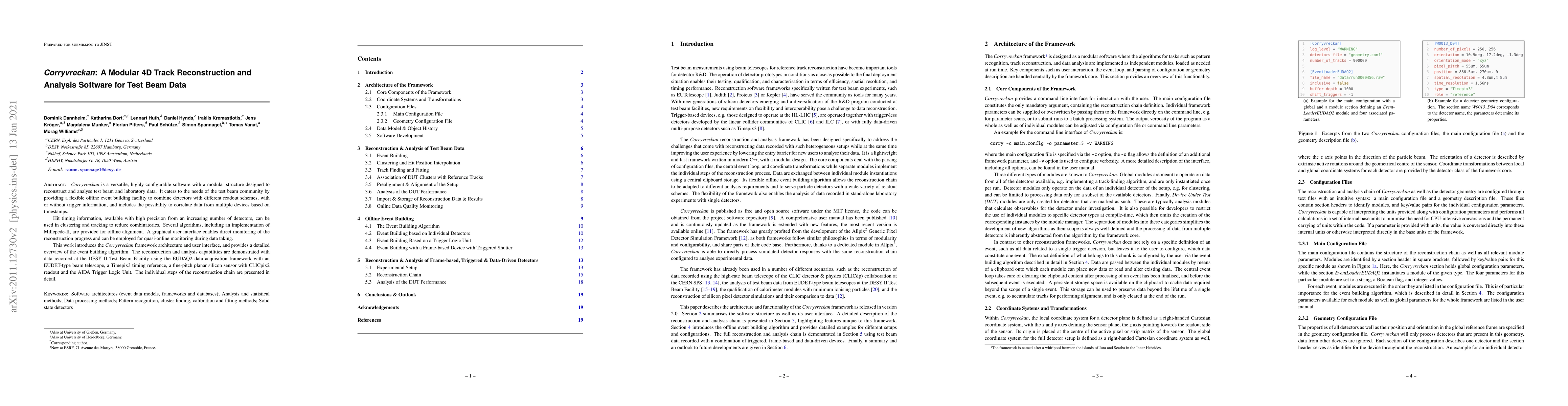 Corryvreckan is a modular software for reconstructing and analyzing test beam data, featuring flexible event building and offline alignment algorithms. It demonstrates its capabilities using data from DESY II Test Beam Facility, showcasing its reconstruction and analysis features.