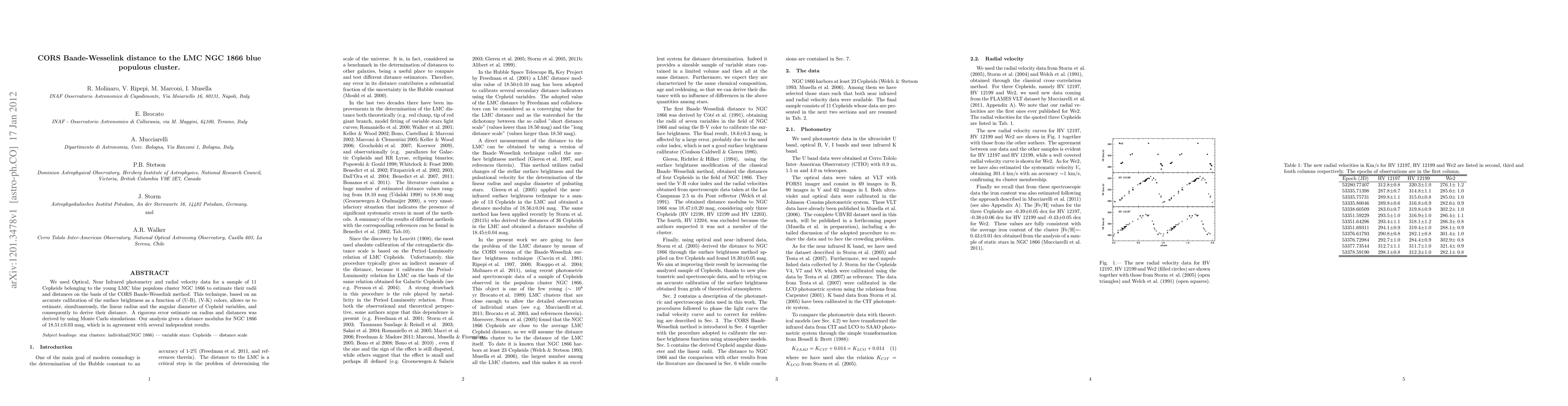 This study estimates the distance to the LMC blue populous cluster NGC 1866 using the CORS Baade-Wesselink method on 11 Cepheids, yielding a distance modulus of 18.51±0.03 mag, consistent with other independent measurements. The method accurately calibrates surface brightness based on color indices to determine Cepheid radii and angular diameters.