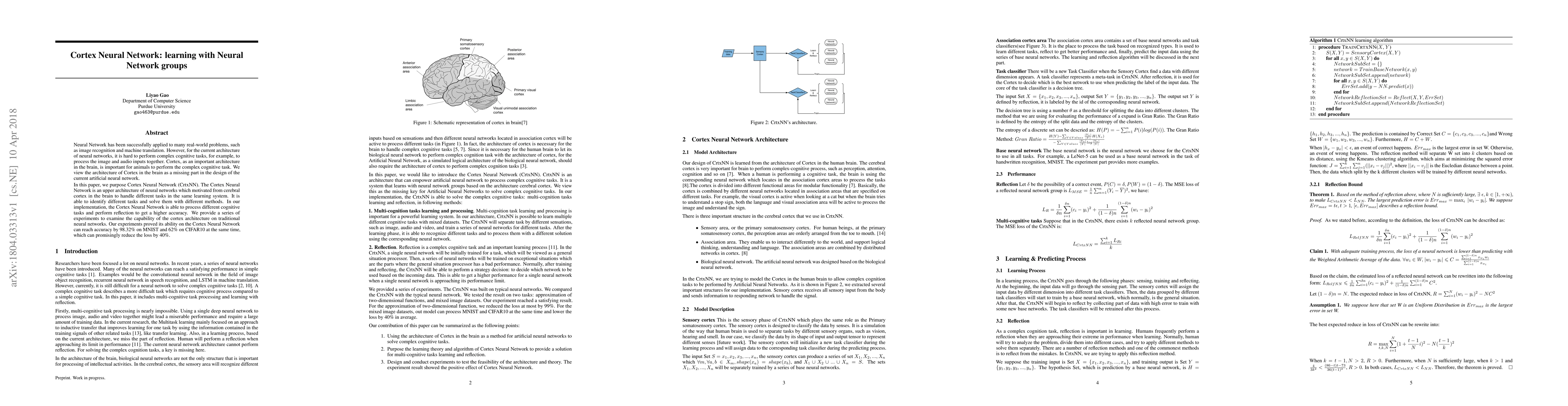 The Cortex Neural Network (CrtxNN) proposes a new architecture inspired by the cerebral cortex to handle multiple cognitive tasks within a single learning system, achieving high accuracy and reducing loss. Experiments show CrtxNN reaches 98.32% accuracy on MNIST and 62% on CIFAR10, demonstrating its potential to enhance traditional neural networks.