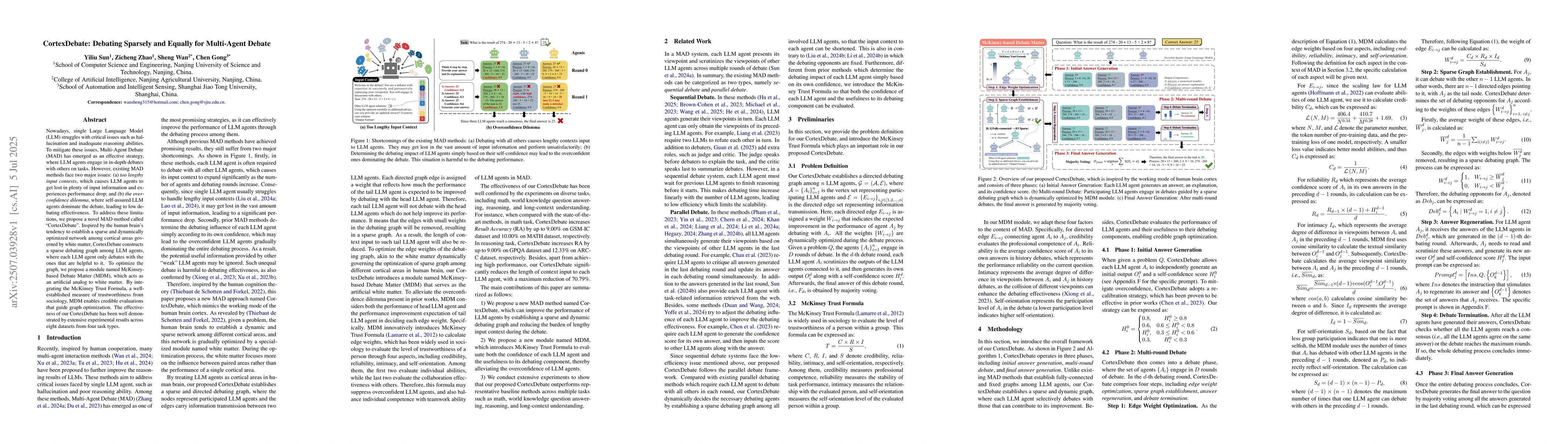 Nowadays, single Large Language Model (LLM) struggles with critical issues such as hallucination and inadequate reasoning abilities. To mitigate these issues, Multi-Agent Debate (MAD) has emerged as an effective strategy, where LLM agents engage in in-depth debates with others on tasks. However, existing MAD methods face two major issues: (a) too lengthy input contexts, which causes LLM agents to get lost in plenty of input information and experiences performance drop; and (b) the overconfidence dilemma, where self-assured LLM agents dominate the debate, leading to low debating effectiveness. To address these limitations, we propose a novel MAD method called "CortexDebate". Inspired by the human brain's tendency to establish a sparse and dynamically optimized network among cortical areas governed by white matter, CortexDebate constructs a sparse debating graph among LLM agents, where each LLM agent only debates with the ones that are helpful to it. To optimize the graph, we propose a module named McKinsey-based Debate Matter (MDM), which acts as an artificial analog to white matter. By integrating the McKinsey Trust Formula, a well-established measure of trustworthiness from sociology, MDM enables credible evaluations that guide graph optimization. The effectiveness of our CortexDebate has been well demonstrated by extensive experimental results across eight datasets from four task types.