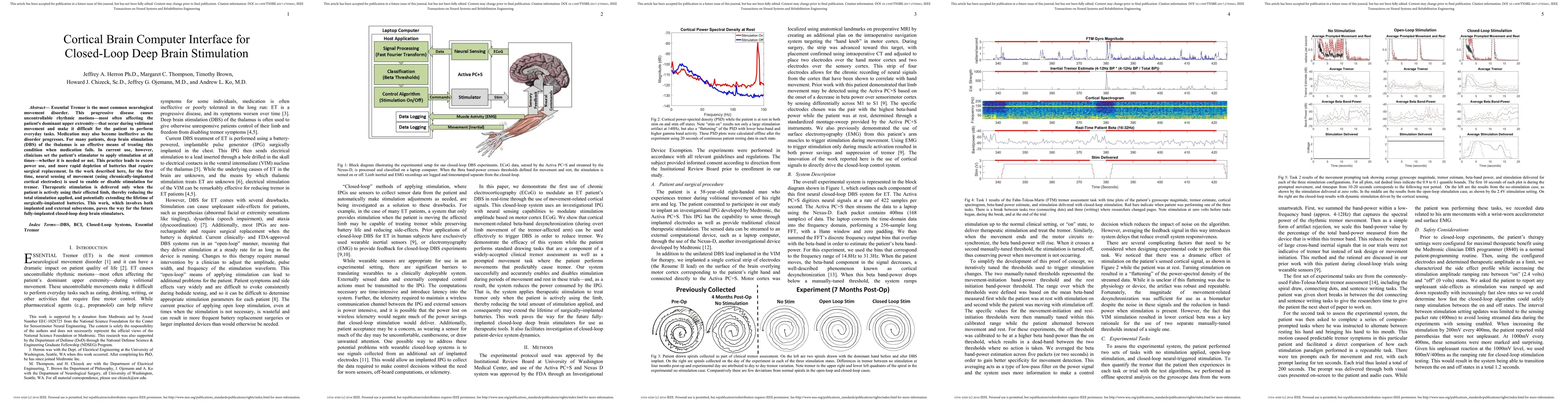 Essential Tremor is the most common neurological movement disorder. This progressive disease causes uncontrollable rhythmic motions -most often affecting the patient's dominant upper extremity- that occur during volitional movement and make it difficult for the patient to perform everyday tasks. Medication may also become ineffective as the disorder progresses. For many patients, deep brain stimulation (DBS) of the thalamus is an effective means of treating this condition when medication fails. In current use, however, clinicians set the patient's stimulator to apply stimulation at all times- whether it is needed or not. This practice leads to excess power use, and more rapid depletion of batteries that require surgical replacement. In the work described here, for the first time, neural sensing of movement (using chronically-implanted cortical electrodes) is used to enable or disable stimulation for tremor. Therapeutic stimulation is delivered only when the patient is actively using their effected limb, thereby reducing the total stimulation applied, and potentially extending the lifetime of surgically-implanted batteries. This work, which involves both implanted and external subsystems, paves the way for the future fully-implanted closed-loop deep brain stimulators.
