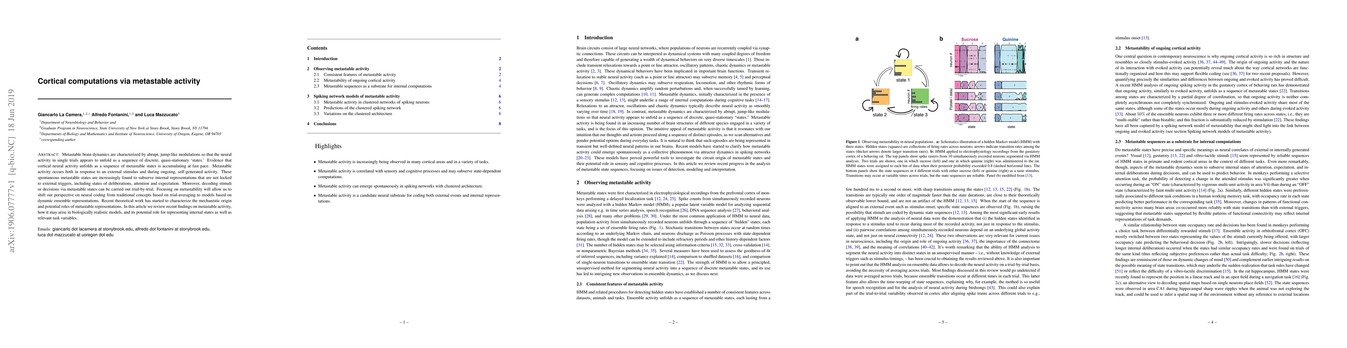 Metastable brain dynamics are characterized by abrupt, jump-like modulations so that the neural activity in single trials appears to unfold as a sequence of discrete, quasi-stationary states. Evidence that cortical neural activity unfolds as a sequence of metastable states is accumulating at fast pace. Metastable activity occurs both in response to an external stimulus and during ongoing, self-generated activity. These spontaneous metastable states are increasingly found to subserve internal representations that are not locked to external triggers, including states of deliberations, attention and expectation. Moreover, decoding stimuli or decisions via metastable states can be carried out trial-by-trial. Focusing on metastability will allow us to shift our perspective on neural coding from traditional concepts based on trial-averaging to models based on dynamic ensemble representations. Recent theoretical work has started to characterize the mechanistic origin and potential roles of metastable representations. In this article we review recent findings on metastable activity, how it may arise in biologically realistic models, and its potential role for representing internal states as well as relevant task variables.