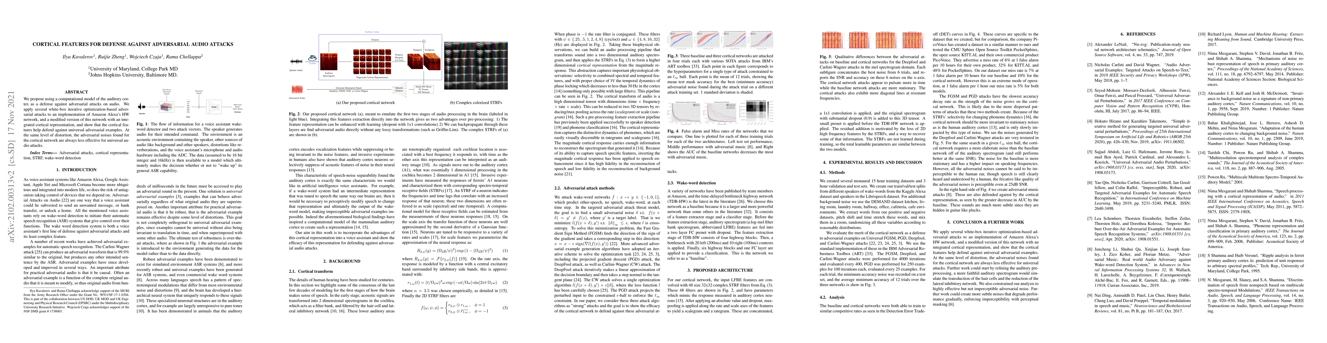 This paper proposes using a computational model of the auditory cortex to defend against adversarial audio attacks, demonstrating that it reduces the effectiveness of universal adversarial examples compared to traditional networks. The authors make the code publicly available for further research.
