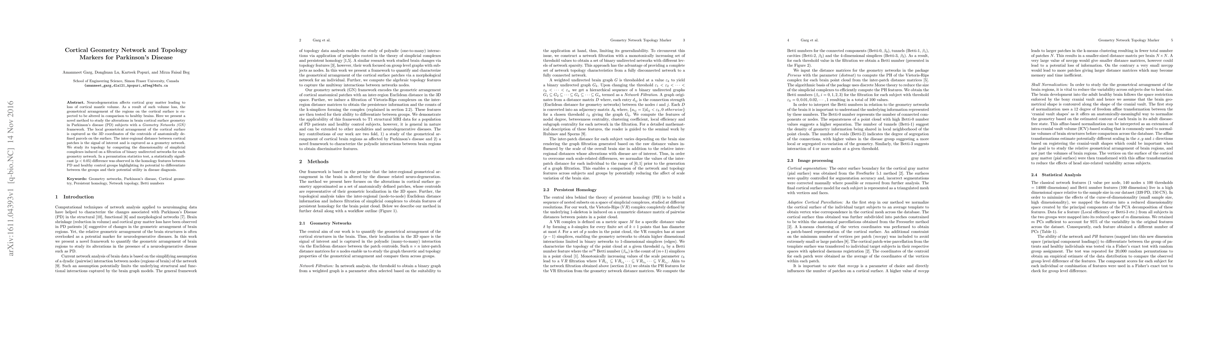 A new method uses geometry networks to study brain surface geometry in Parkinson's disease, finding a statistically significant difference between patient and healthy brains.