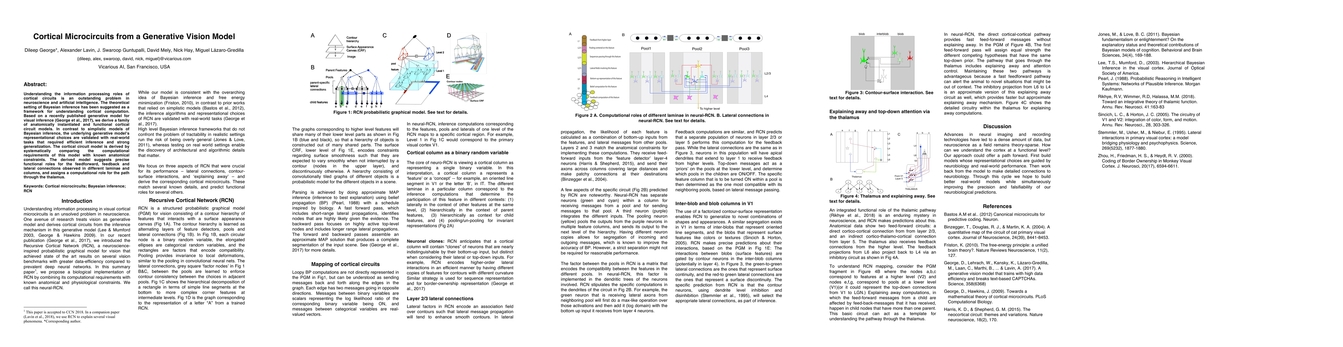 Understanding the information processing roles of cortical circuits is an outstanding problem in neuroscience and artificial intelligence. The theoretical setting of Bayesian inference has been suggested as a framework for understanding cortical computation. Based on a recently published generative model for visual inference (George et al., 2017), we derive a family of anatomically instantiated and functional cortical circuit models. In contrast to simplistic models of Bayesian inference, the underlying generative model's representational choices are validated with real-world tasks that required efficient inference and strong generalization. The cortical circuit model is derived by systematically comparing the computational requirements of this model with known anatomical constraints. The derived model suggests precise functional roles for the feedforward, feedback and lateral connections observed in different laminae and columns, and assigns a computational role for the path through the thalamus.