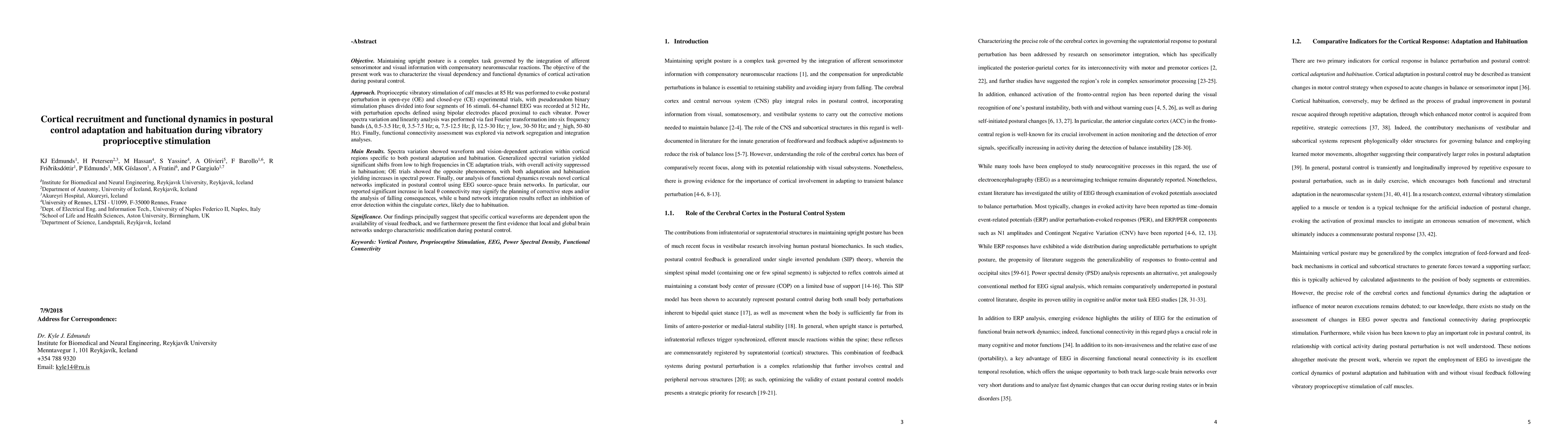 Maintaining upright posture is a complex task governed by the integration of afferent sensorimotor and visual information with compensatory neuromuscular reactions. The objective of this work was to characterize the visual dependency and functional dynamics of cortical activation during postural control. Proprioceptic vibratory stimulation of calf muscles at 85 Hz was performed to evoke postural perturbation in open-eye (OE) and closed-eye (CE) experimental trials, with pseudorandom binary stimulation phases divided into four segments of 16 stimuli. 64-channel EEG was recorded; with perturbation epochs defined using bipolar electrodes placed proximal to each vibrator. Finally, functional connectivity assessment was explored via network segregation and integration analyses. Spectra variation showed waveform and vision-dependent activation within cortical regions specific to both postural adaptation and habituation. Generalized spectral variation yielded significant shifts from low to high frequencies in CE adaptation trials, with overall activity suppressed in habituation; OE trials showed the opposite phenomenon, with both adaptation and habituation yielding increases in spectral power. Finally, our analysis of functional dynamics reveals novel cortical networks implicated in postural control using EEG source-space brain networks. In particular, our reported significant increase in local theta connectivity may signify the planning of corrective steps and/or the analysis of falling consequences, while alpha band network integration results reflect an inhibition of error detection within the cingulate cortex, likely due to habituation. Our findings suggest that specific cortical waveforms are dependent upon the availability of visual feedback, and we present the first evidence that local and global brain networks undergo characteristic modification during postural control.