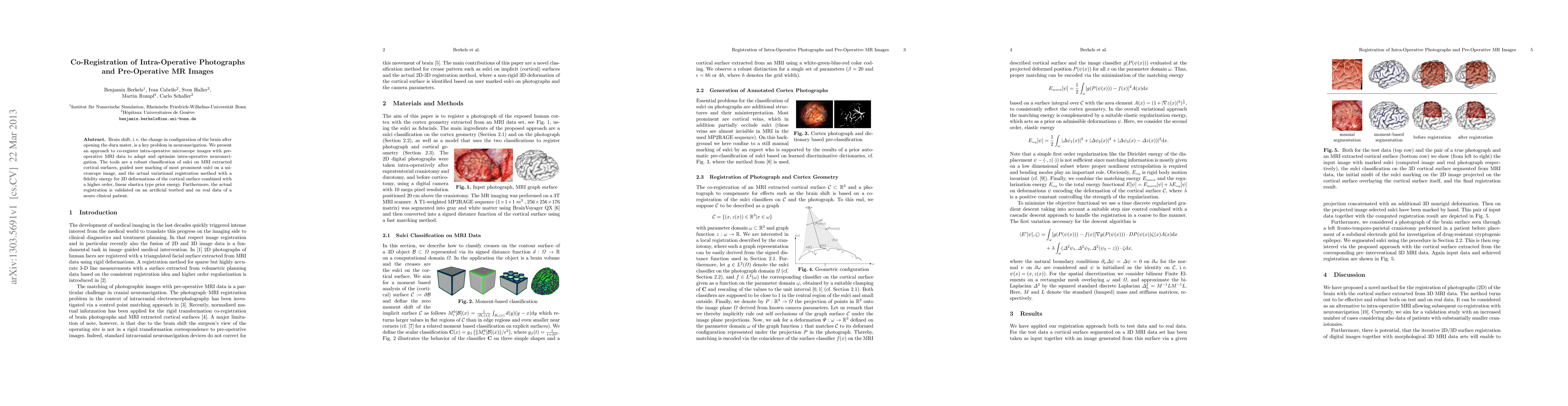 This paper proposes a method for co-registering intra-operative microscope images with pre-operative MRI to address brain shift during neuronavigation, utilizing cortical surface classification, user-marked sulci, and a variational registration method with elastic prior energy. The approach is validated both on artificial data and real clinical patient data.