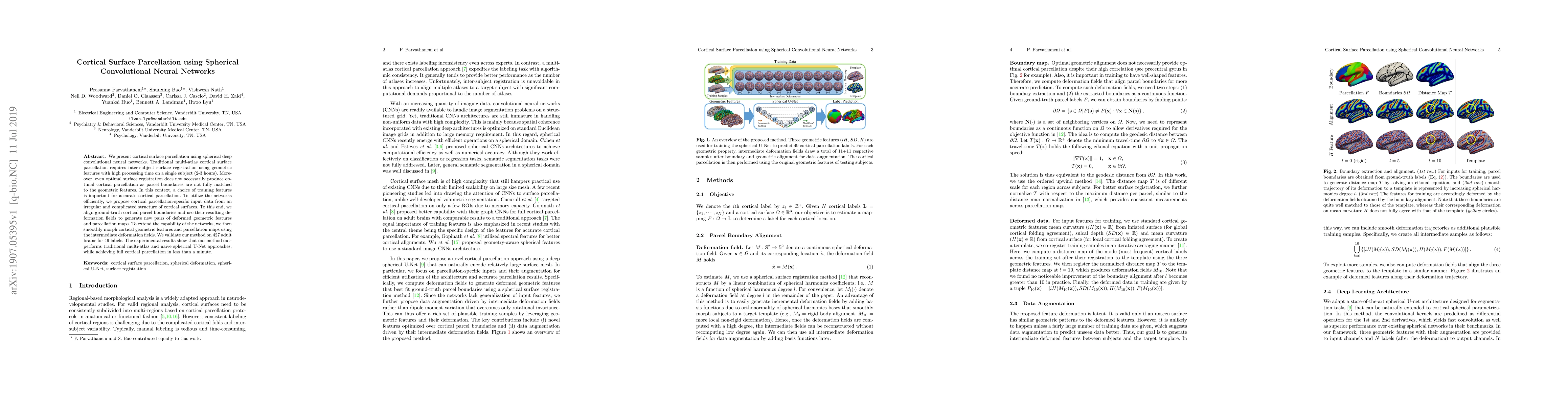 This paper proposes a novel cortical surface parcellation method using spherical convolutional neural networks, which significantly reduces processing time compared to traditional methods. The approach efficiently morphs cortical geometric features and parcellation maps, achieving accurate parcellation in under a minute on 427 adult brains.