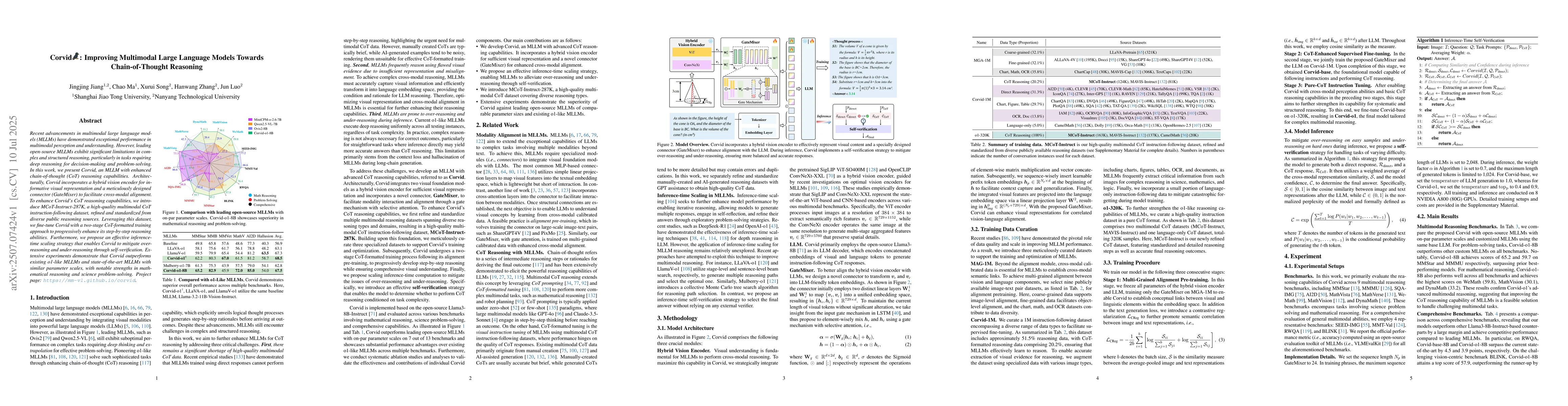 Recent advancements in multimodal large language models (MLLMs) have demonstrated exceptional performance in multimodal perception and understanding. However, leading open-source MLLMs exhibit significant limitations in complex and structured reasoning, particularly in tasks requiring deep reasoning for decision-making and problem-solving. In this work, we present Corvid, an MLLM with enhanced chain-of-thought (CoT) reasoning capabilities. Architecturally, Corvid incorporates a hybrid vision encoder for informative visual representation and a meticulously designed connector (GateMixer) to facilitate cross-modal alignment. To enhance Corvid's CoT reasoning capabilities, we introduce MCoT-Instruct-287K, a high-quality multimodal CoT instruction-following dataset, refined and standardized from diverse public reasoning sources. Leveraging this dataset, we fine-tune Corvid with a two-stage CoT-formatted training approach to progressively enhance its step-by-step reasoning abilities. Furthermore, we propose an effective inference-time scaling strategy that enables Corvid to mitigate over-reasoning and under-reasoning through self-verification. Extensive experiments demonstrate that Corvid outperforms existing o1-like MLLMs and state-of-the-art MLLMs with similar parameter scales, with notable strengths in mathematical reasoning and science problem-solving. Project page: https://mm-vl.github.io/corvid.