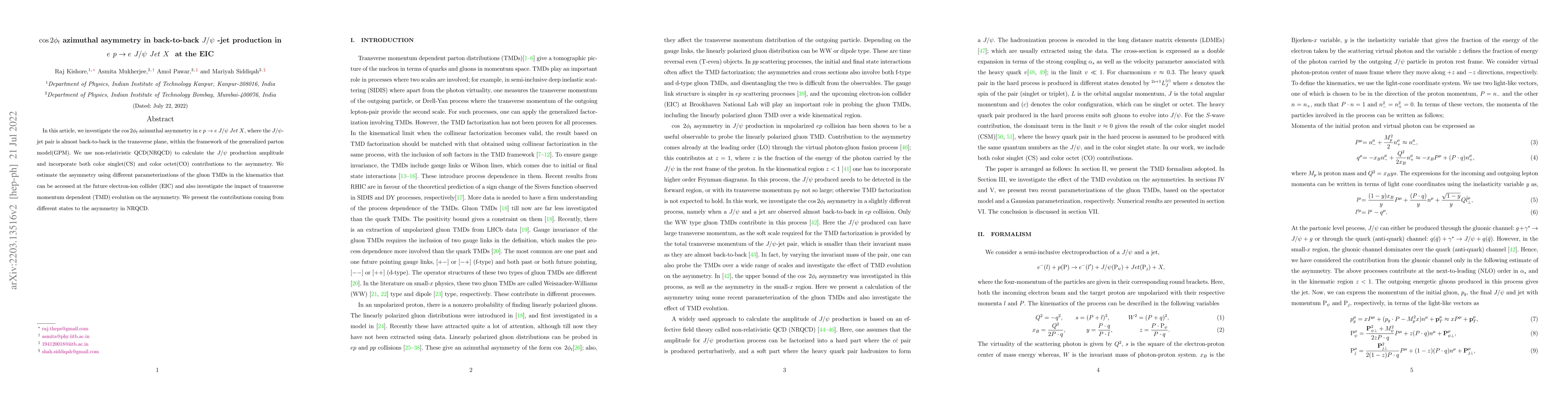 In this article, we investigate the $\cos2\phi_t$ azimuthal asymmetry in $e ~p\rightarrow e ~J/\psi ~Jet~ X$, where the $J/\psi$-jet pair is almost back-to-back in the transverse plane, within the framework of the generalized parton model(GPM). We use non-relativistic QCD(NRQCD) to calculate the $J/\psi$ production amplitude and incorporate both color singlet(CS) and color octet(CO) contributions to the asymmetry. We estimate the asymmetry using different parameterizations of the gluon TMDs in the kinematics that can be accessed at the future electron-ion collider (EIC) and also investigate the impact of transverse momentum dependent (TMD) evolution on the asymmetry. We present the contributions coming from different states to the asymmetry in NRQCD.