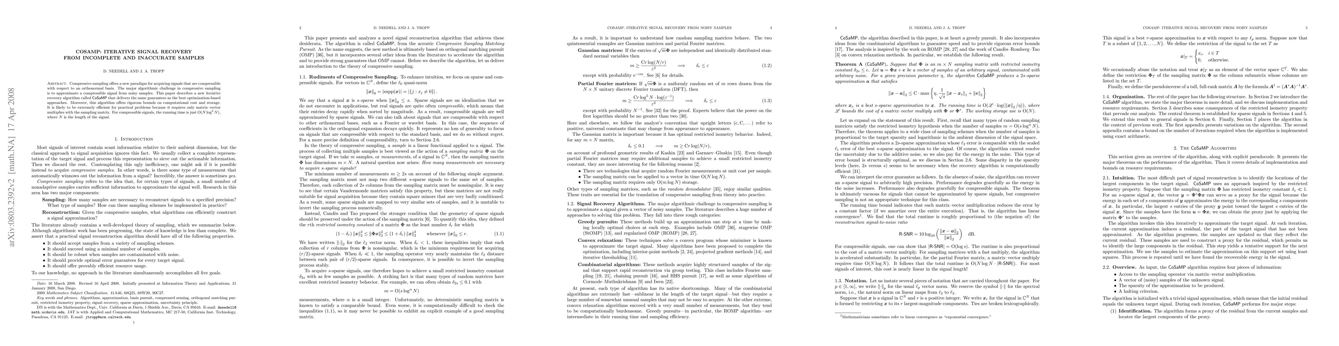 CoSaMP is an iterative algorithm for recovering compressible signals from incomplete and noisy samples, offering comparable performance to optimization-based methods while providing rigorous computational cost and storage bounds. Its efficiency is highlighted by a running time of O(N*log^2(N)).