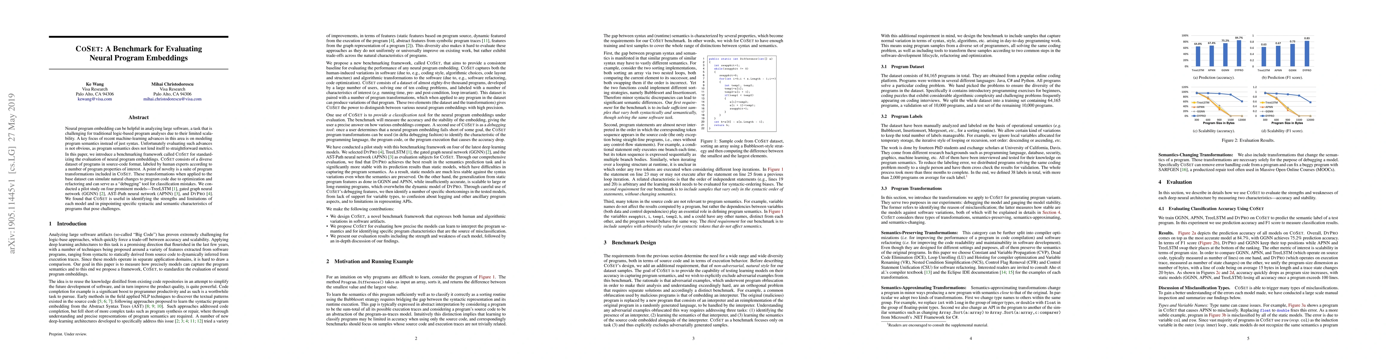 The paper introduces COSET, a benchmarking framework for evaluating neural program embeddings, featuring a dataset of source-code programs labeled by experts and transformations simulating code changes. A pilot study on four models highlights COSET's effectiveness in identifying model strengths, weaknesses, and challenging program characteristics.