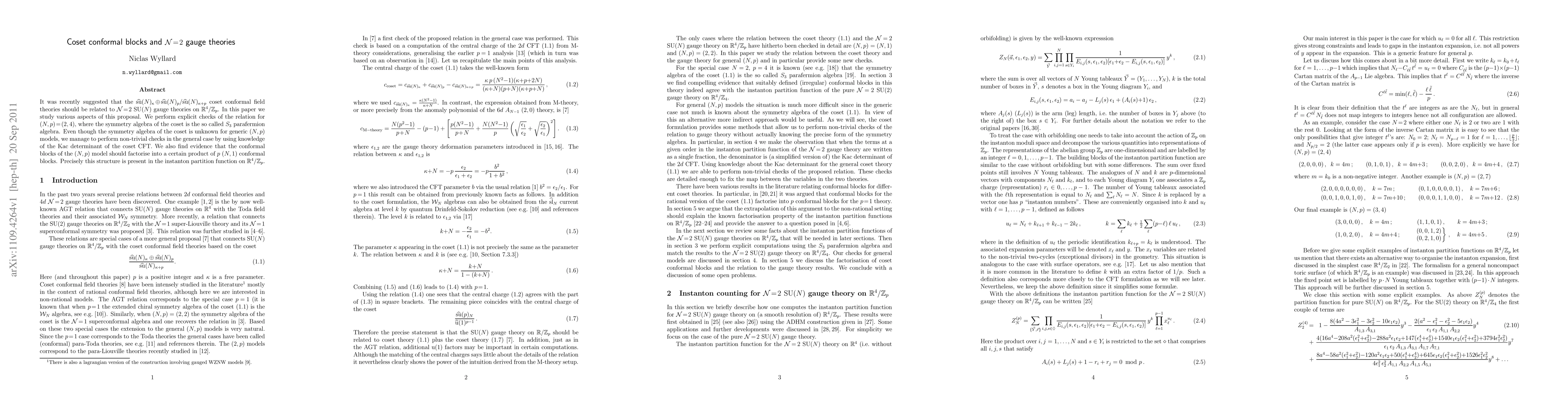 It was recently suggested that the su(N)_k+su(N)_p/su(N)_{k+p} coset conformal field theories should be related to N=2 SU(N) gauge theories on R^4/Z_p. In this paper we study various aspects of this proposal. We perform explicit checks of the relation for (N,p)=(2,4), where the symmetry algebra of the coset is the so called S_3 parafermion algebra. Even though the symmetry algebra of the coset is unknown for generic (N,p) models, we manage to perform non-trivial checks in the general case by using knowledge of the Kac determinant of the coset CFT. We also find evidence that the conformal blocks of the (N,p) model should factorise into a certain product of p (N,1) conformal blocks. Precisely this structure is present in the instanton partition function on R^4/Z_p.