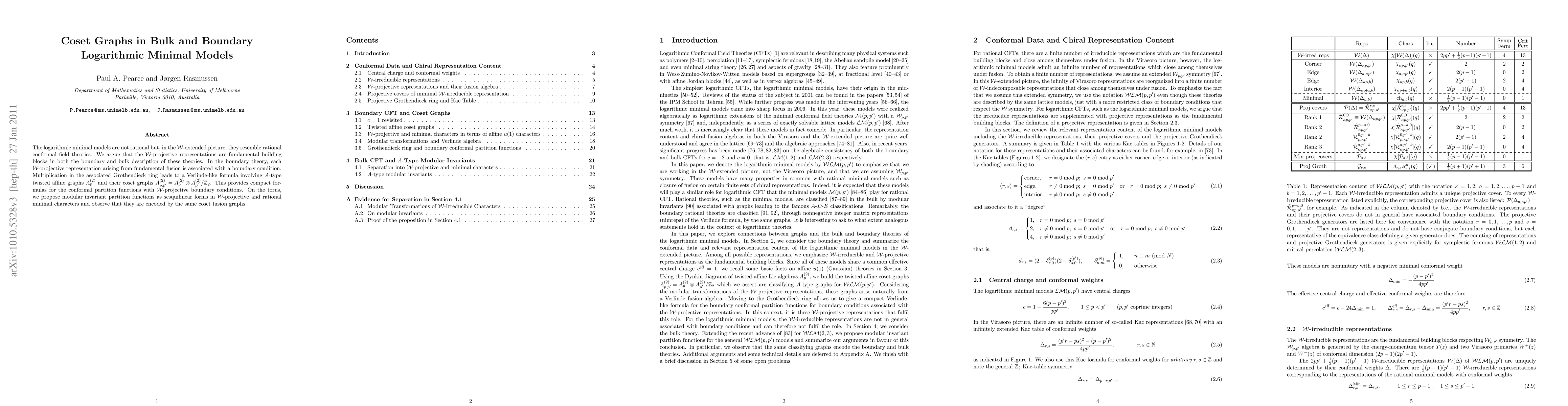 The logarithmic minimal models are not rational but, in the W-extended picture, they resemble rational conformal field theories. We argue that the W-projective representations are fundamental building blocks in both the boundary and bulk description of these theories. In the boundary theory, each W-projective representation arising from fundamental fusion is associated with a boundary condition. Multiplication in the associated Grothendieck ring leads to a Verlinde-like formula involving A-type twisted affine graphs A^{(2)}_{p} and their coset graphs A^{(2)}_{p,p'}=A^{(2)}_{p} x A^{(2)}_{p'}/Z_2. This provides compact formulas for the conformal partition functions with W-projective boundary conditions. On the torus, we propose modular invariant partition functions as sesquilinear forms in W-projective and rational minimal characters and observe that they are encoded by the same coset fusion graphs.