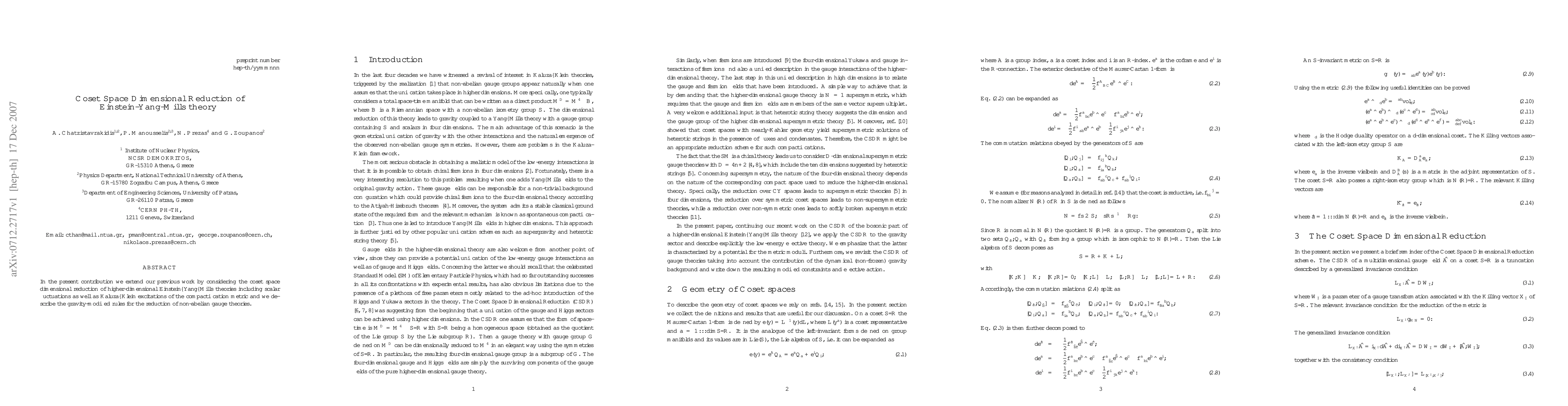 In the present contribution we extend our previous work by considering the coset space dimensional reduction of higher-dimensional Einstein--Yang--Mills theories including scalar fluctuations as well as Kaluza--Klein excitations of the compactification metric and we describe the gravity-modified rules for the reduction of non-abelian gauge theories.