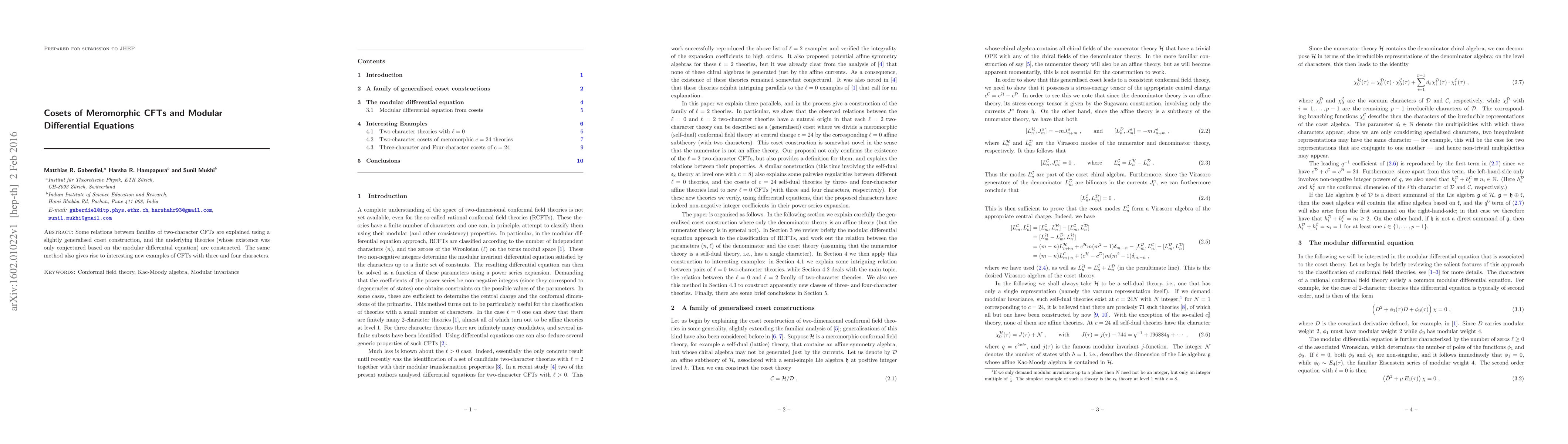 Some relations between families of two-character CFTs are explained using a slightly generalised coset construction, and the underlying theories (whose existence was only conjectured based on the modular differential equation) are constructed. The same method also gives rise to interesting new examples of CFTs with three and four characters.