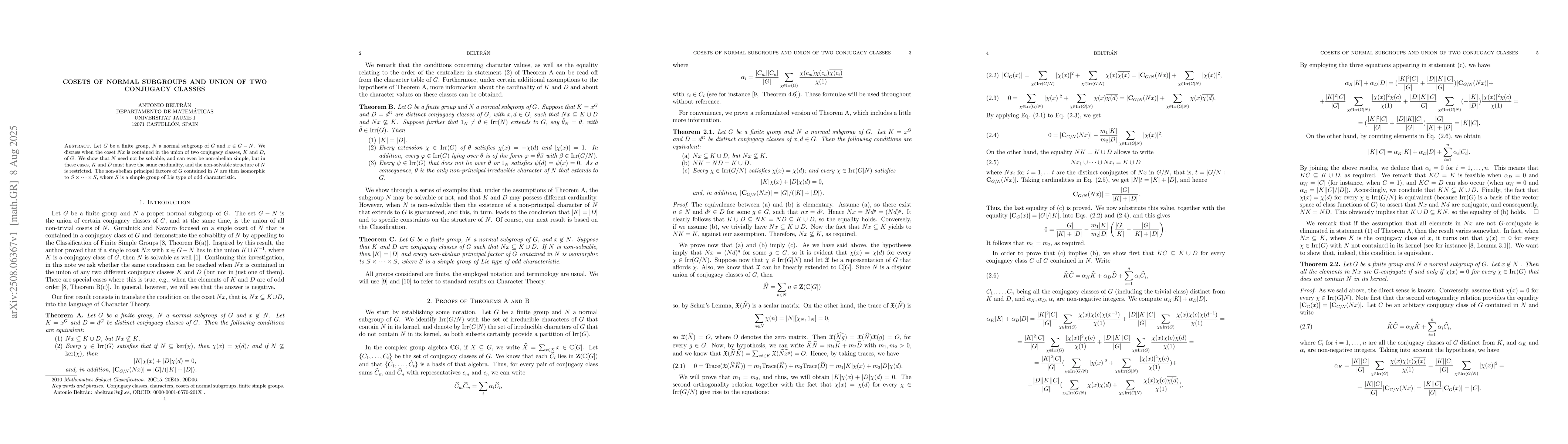The paper introduces and proves several theorems that characterize the conditions under which cosets of normal subgroups are contained within the union of two conjugacy classes, providing a deeper understanding of group structures.